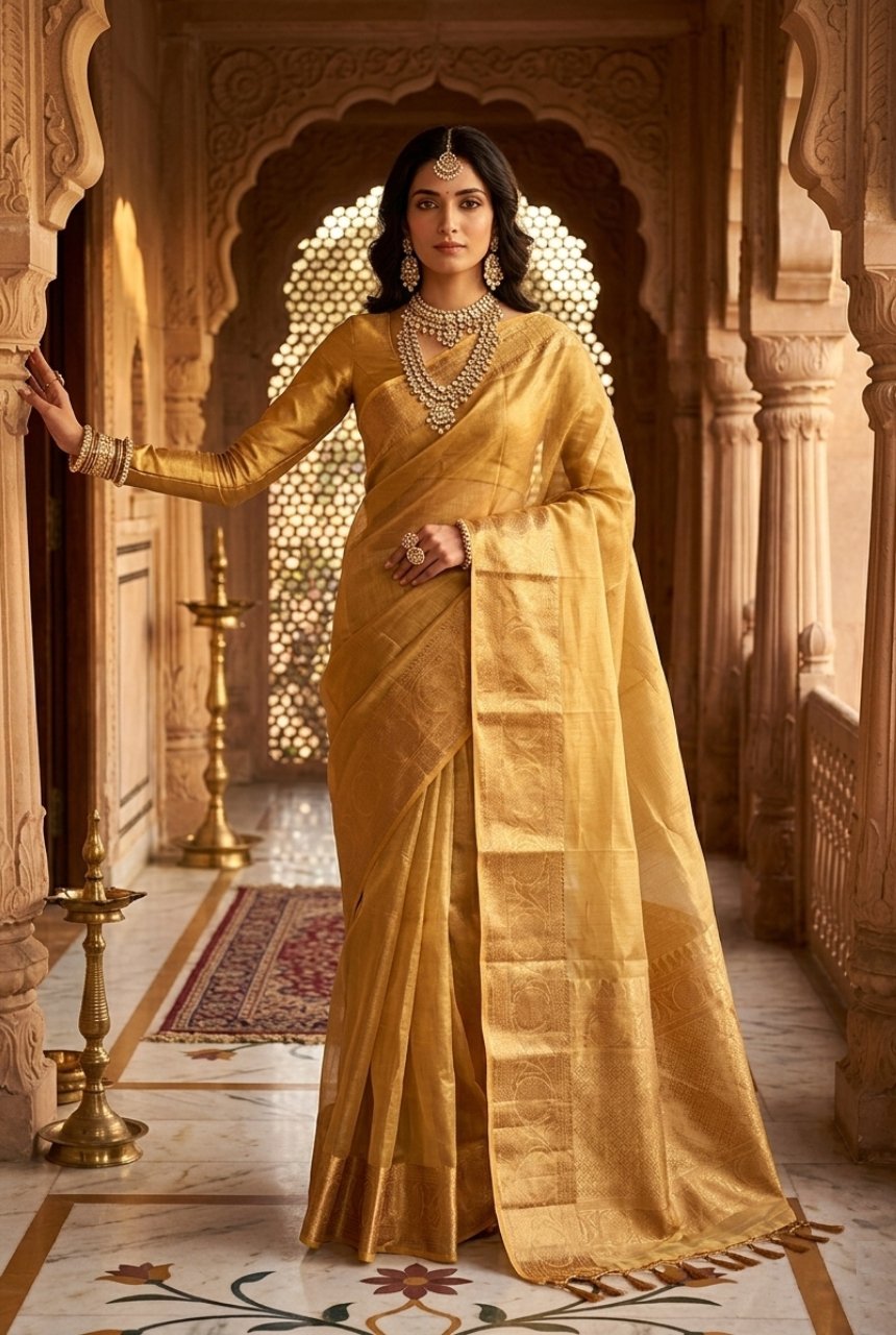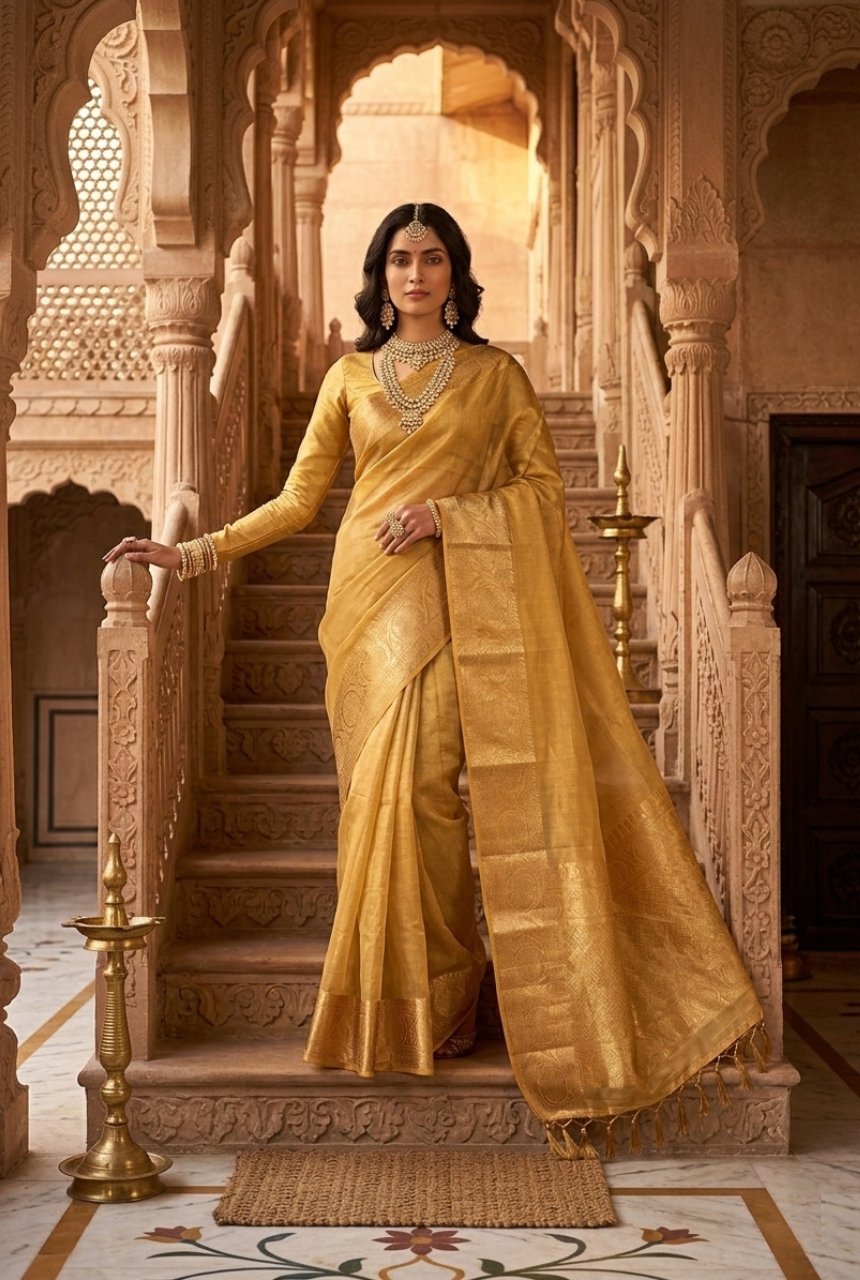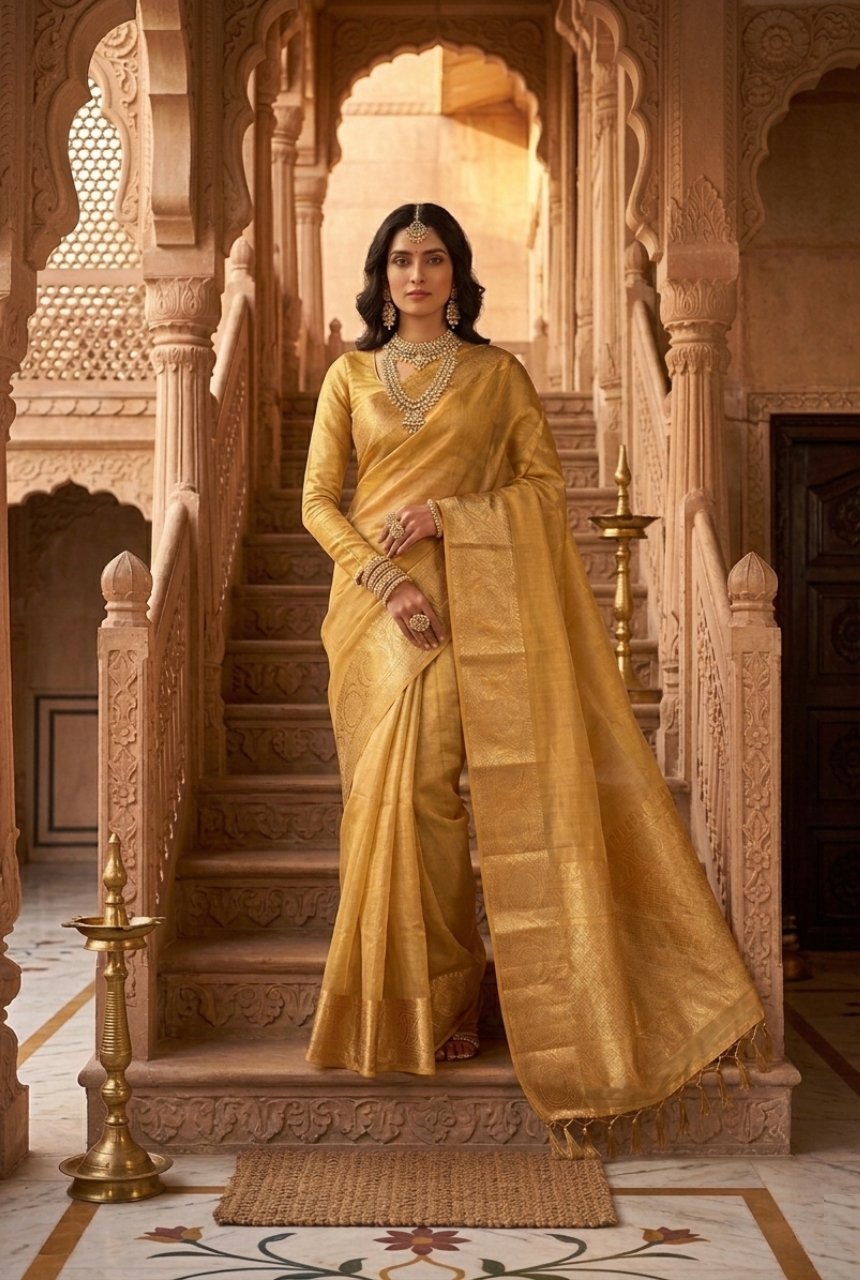 Golden Yellow Saree With Gold & Yellow Zari Checks and Running Blouse