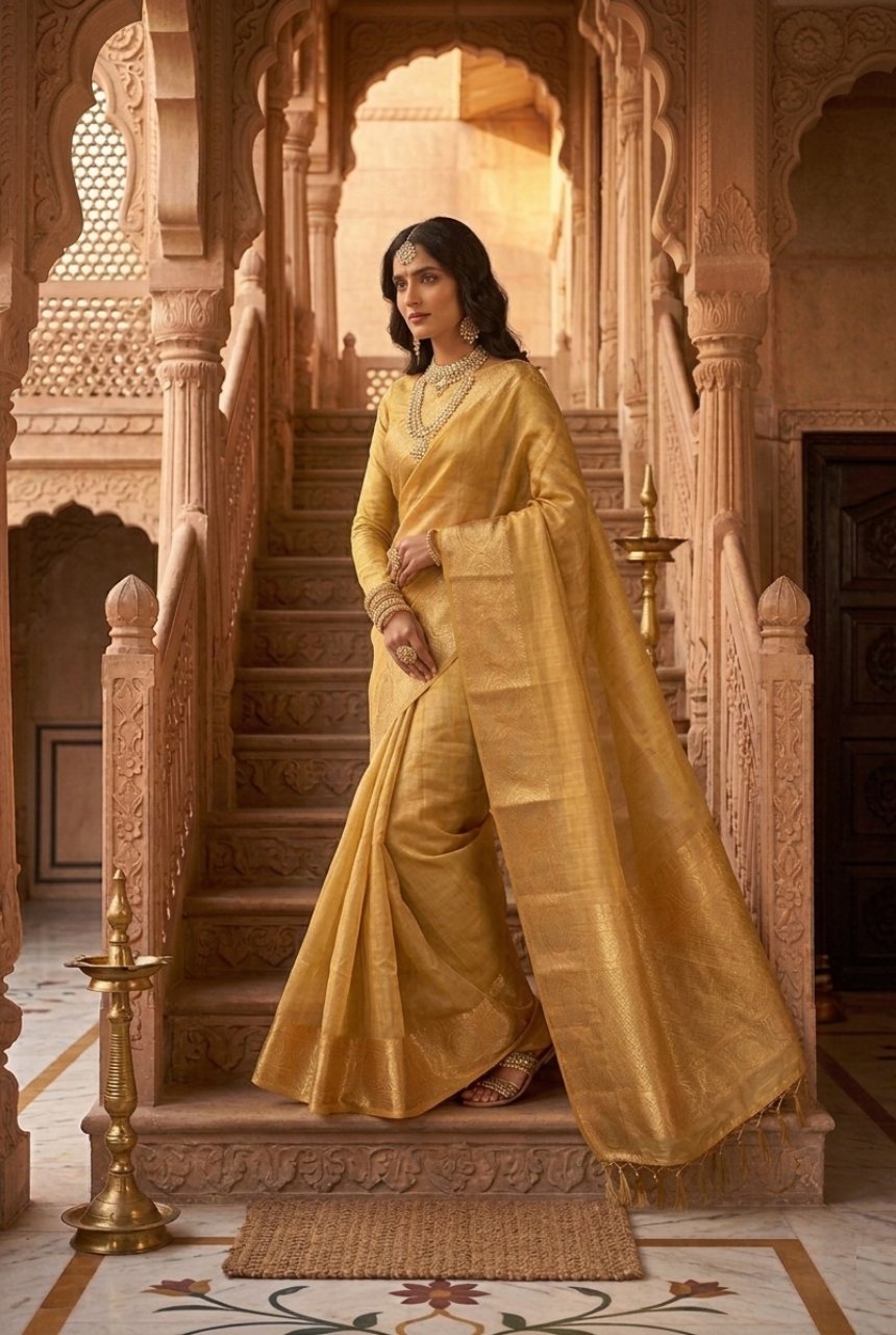 Loaded with Zari work on broad border catches all eyes around. Flawless beautiful subtle yellow tone adds charm to every function with calm aura and peaceful presence. Body of saree is calm plain yellow with golden hue. Broad border has very intricate Zari work holding grace and poise.