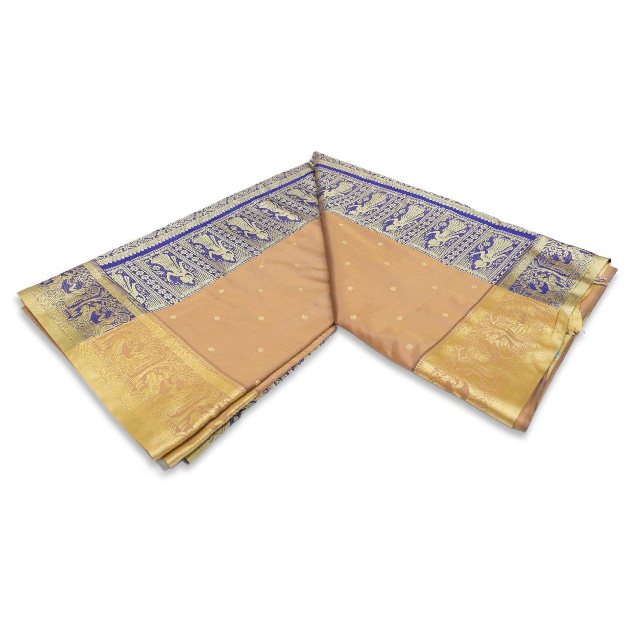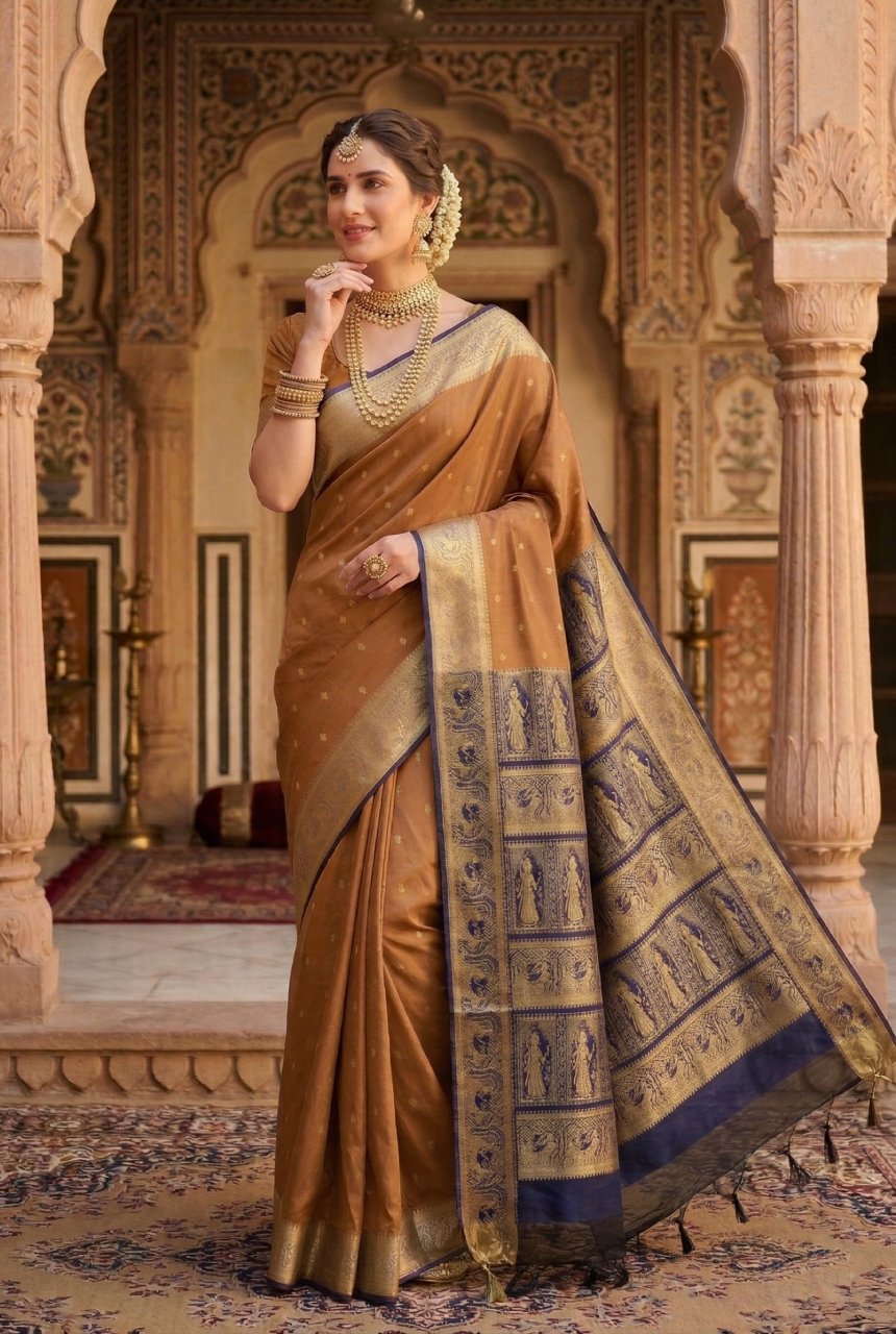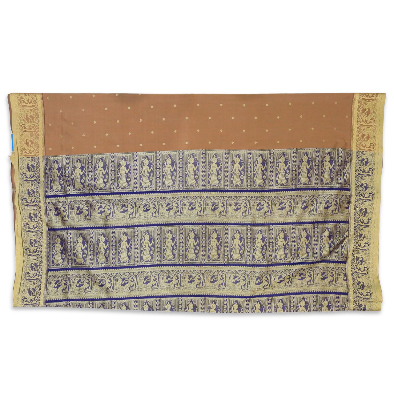 A caramel brown body with fine gold Zari dot motifs spread across the body with golden Zari border depicting horse carriage under tree in finest form. Pallu adding charm in royal indigo color with stripes having women figurine and horse carriage under tree in alternate stripes giving it rich traditional look and aristocratic charisma.