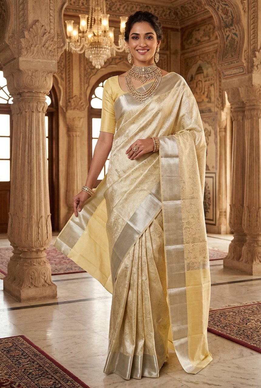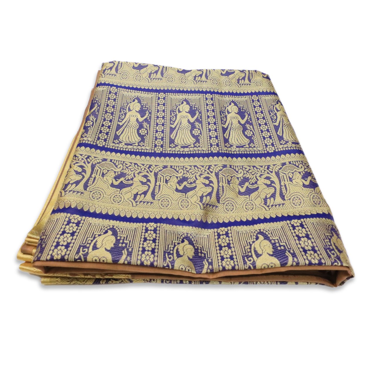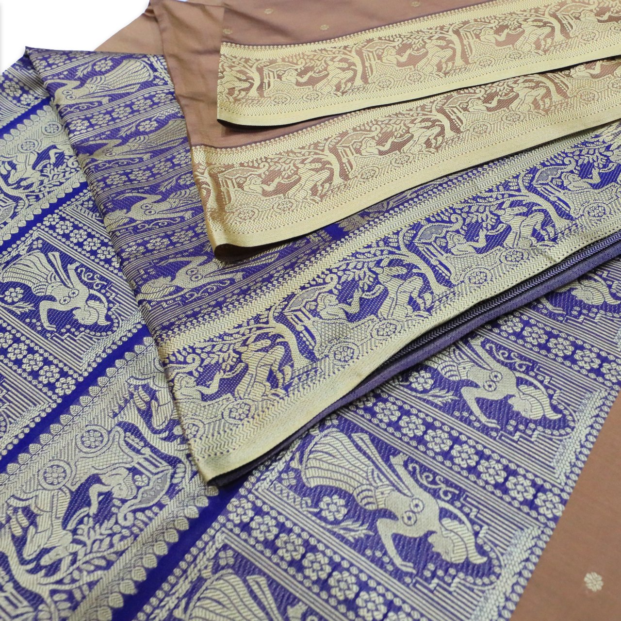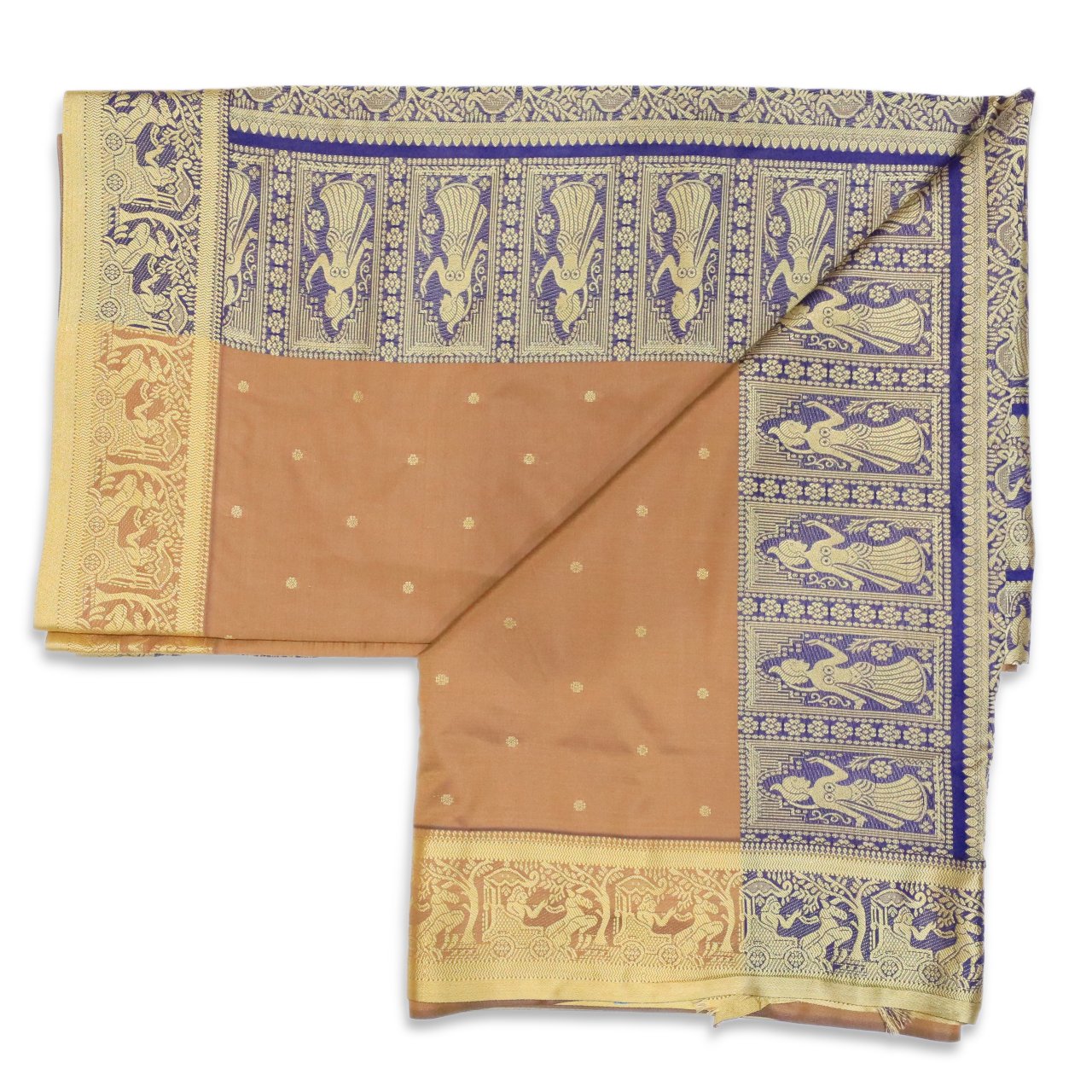 A caramel brown body with fine gold Zari dot motifs spread across the body with golden Zari border depicting horse carriage under tree in finest form. Pallu adding charm in royal indigo color with stripes having women figurine and horse carriage under tree in alternate stripes giving it rich traditional look and aristocratic charisma.