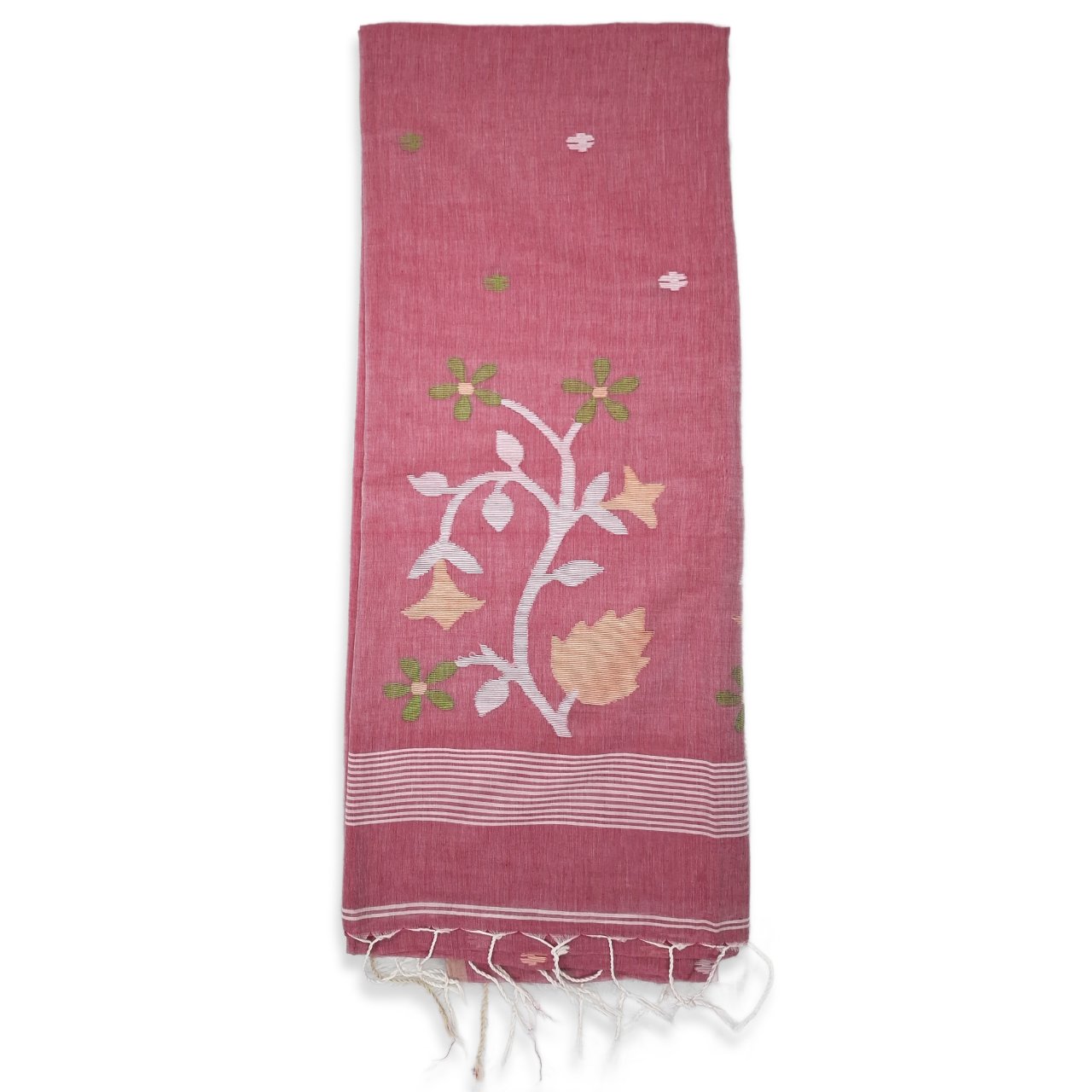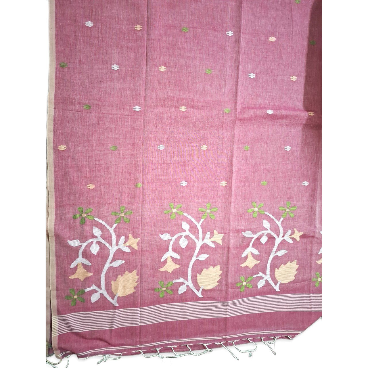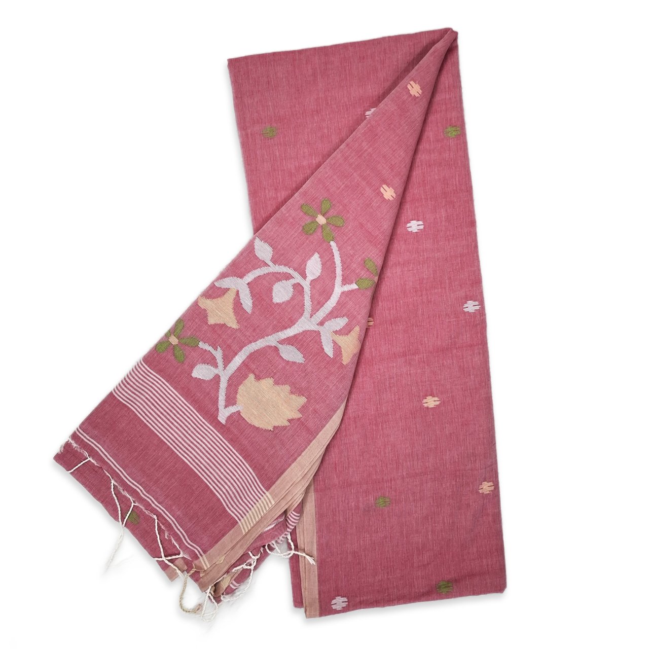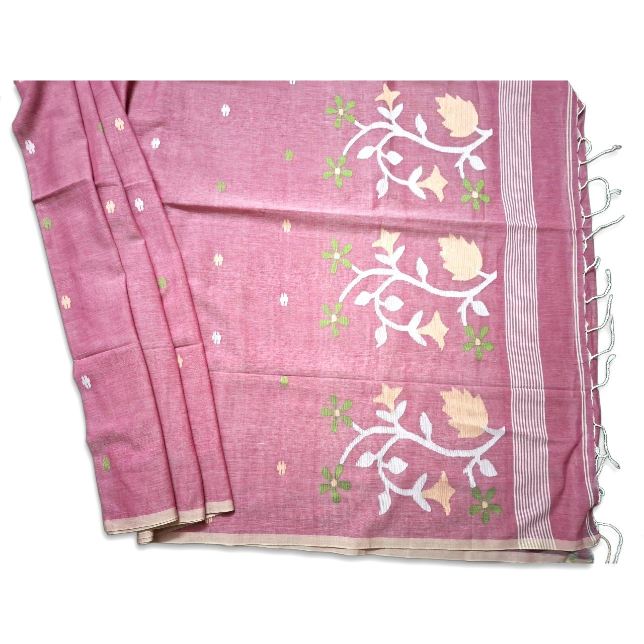Rose pink cotton saree with white light golden and green motifs on whole saree and a beautiful floral creeper motifs on pallu with white tassels with a running blouse piece.
