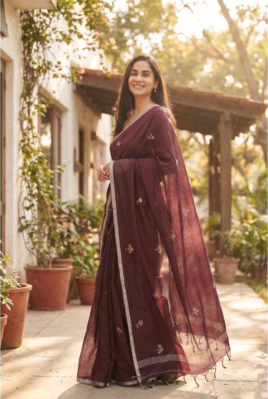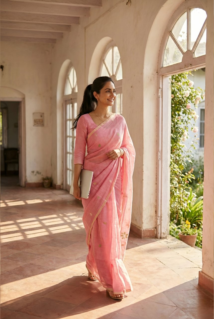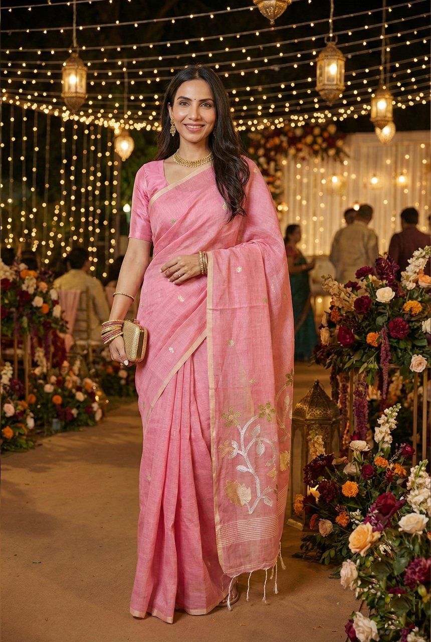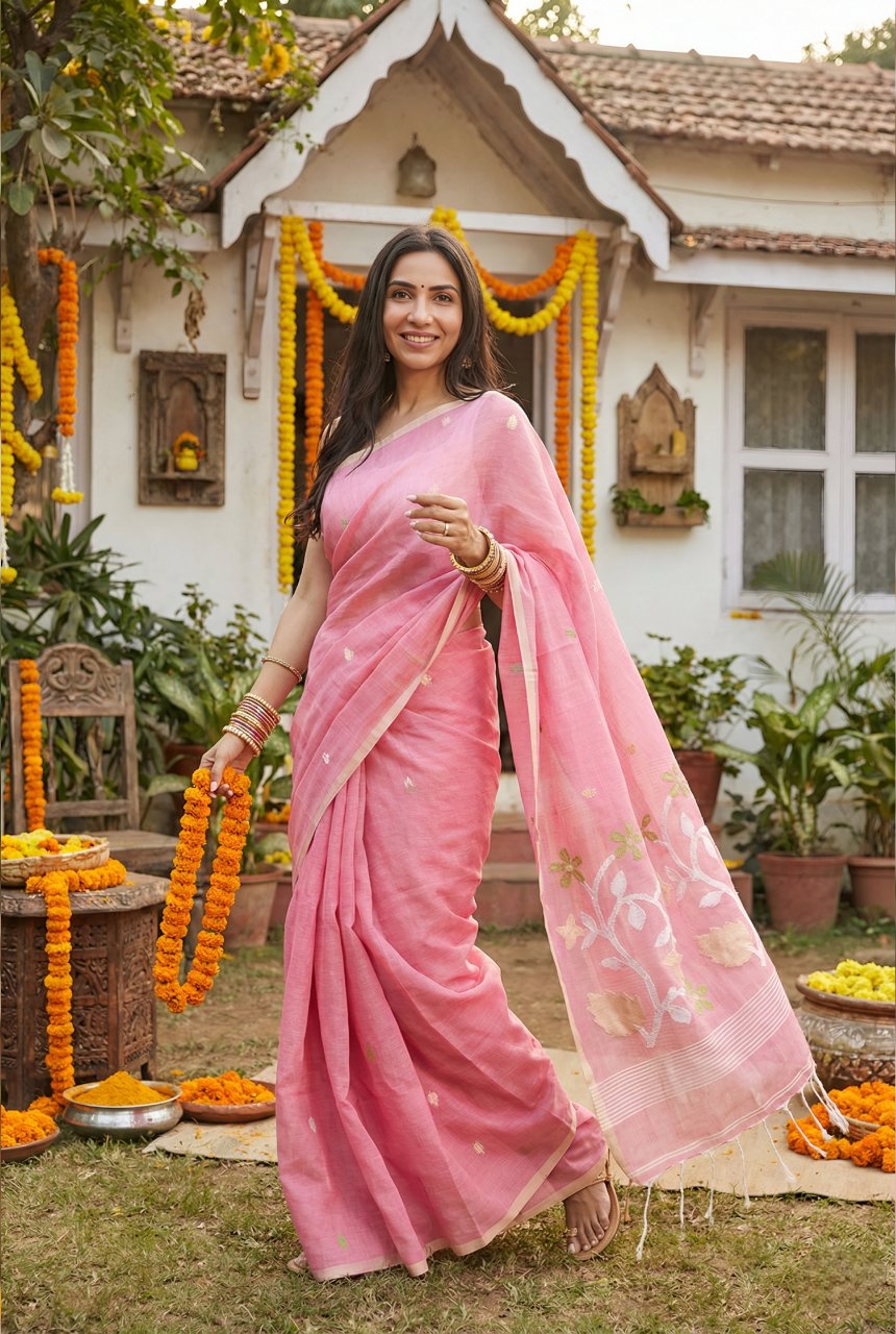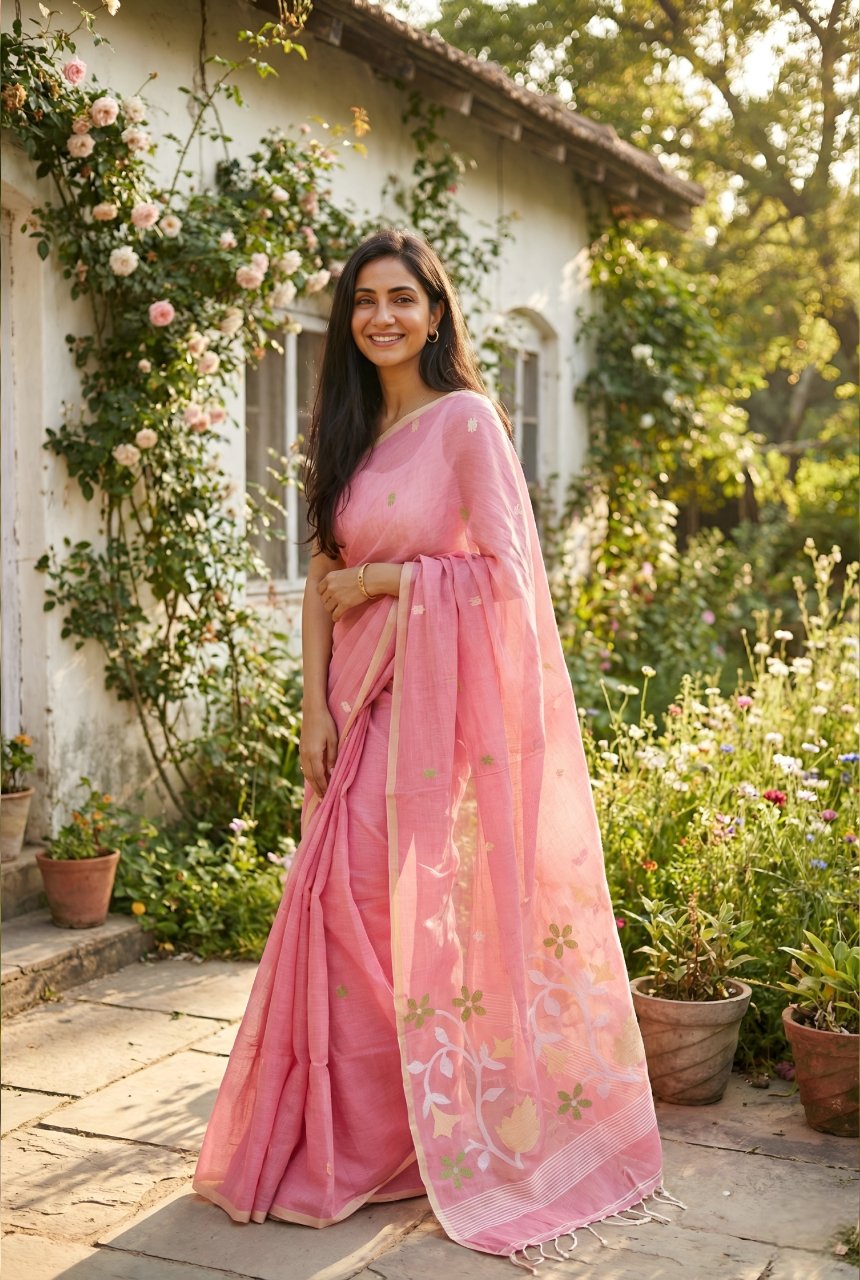 Rose pink cotton saree with white light golden and green motifs on whole saree and a beautiful floral creeper motifs on pallu with white tassels with a running blouse piece.