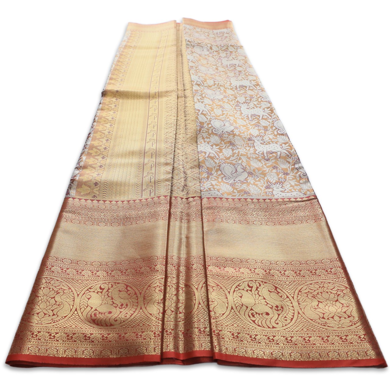 One in a million saree having soft antique gold base enriched with intricately woven with animal and floral motifs giving a majestic view of Indian rich flora and fauna, deer playing around, peacock dancing in bushes. The broad border has traditional floral and paisley motifs adding depth and contrast. Pallu has dense classic ornamental weaving patterns.