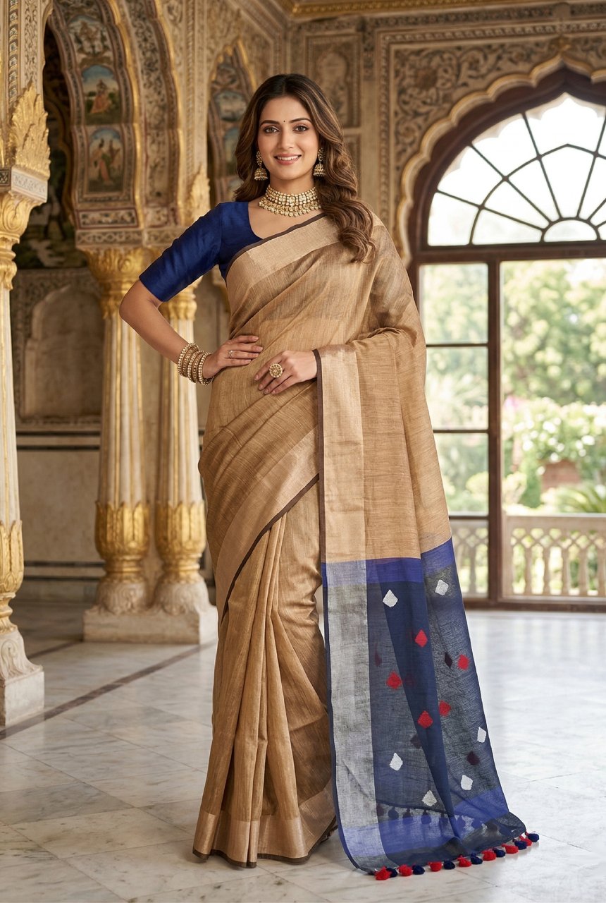 Earthy Beige & Blue Linen Saree