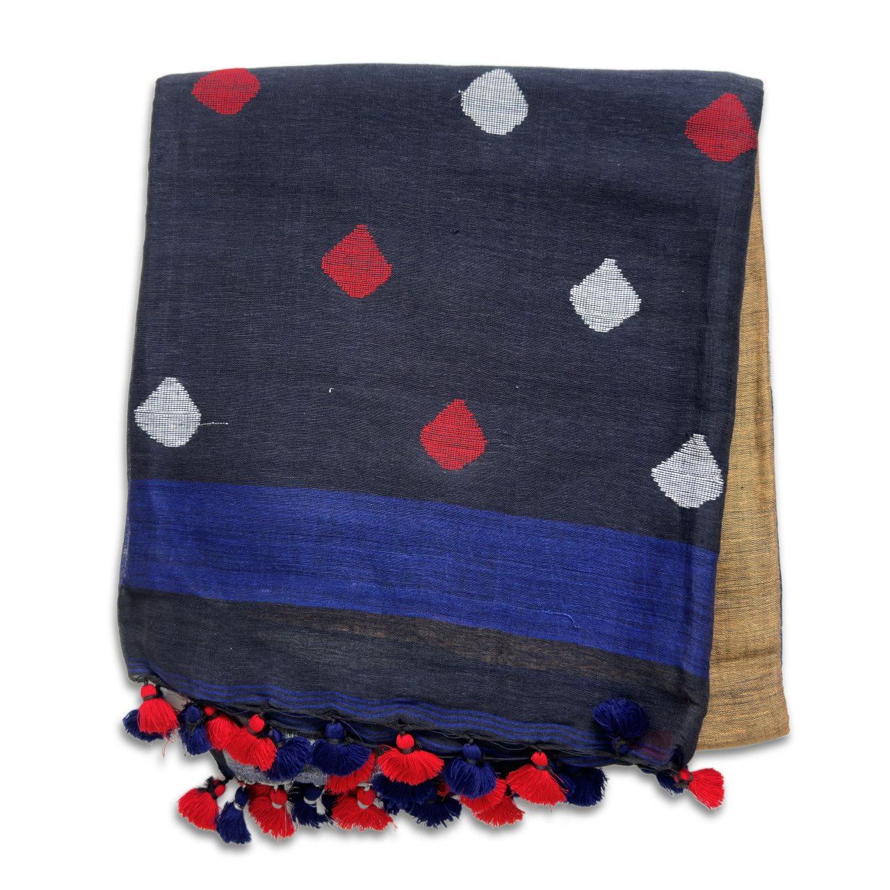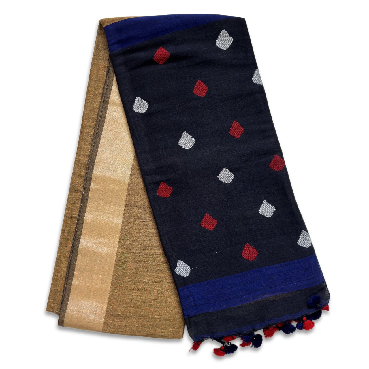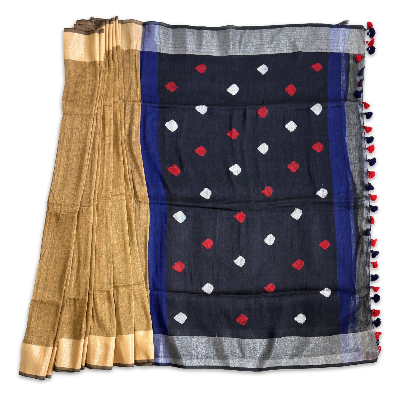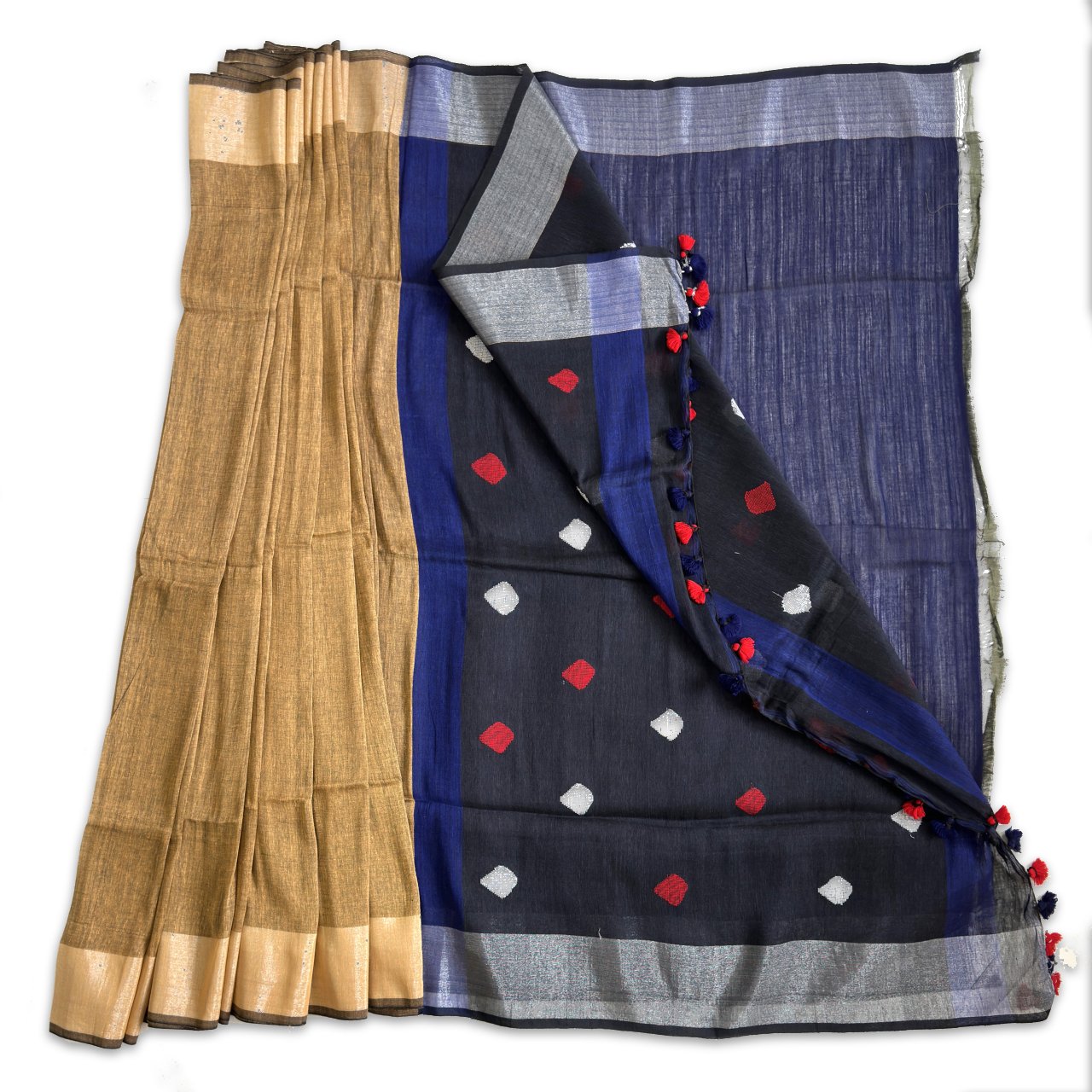 Earthy beige plain body of saree with fine weave making it rich in texture with navy blue stripe merging the body of saree into pallu which is dark deep blue adding a striking contrast and elite clothing choice. Saree is framed in light beige color border in body adding subtle definition to saree. Pallu has dark deep blue color with red and steel grey diamond design self-weave motifs enhancing the sarees grace and stye, pallu ends with hand tied red and blue tassels.