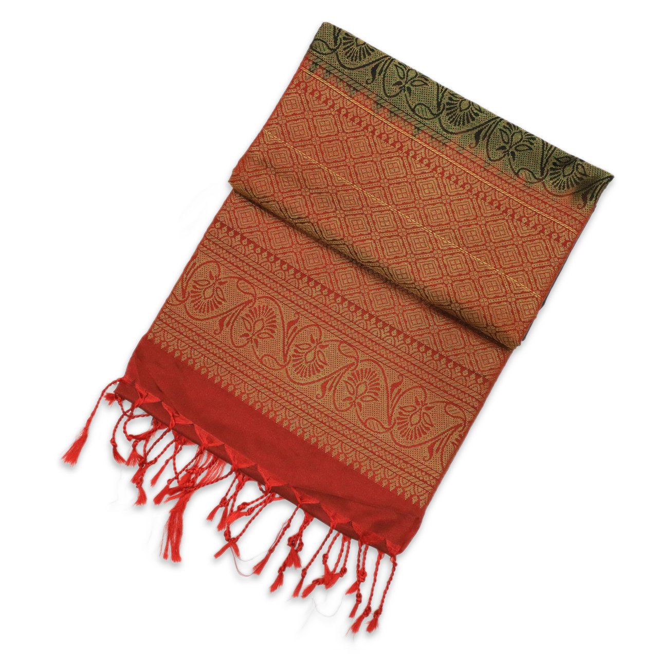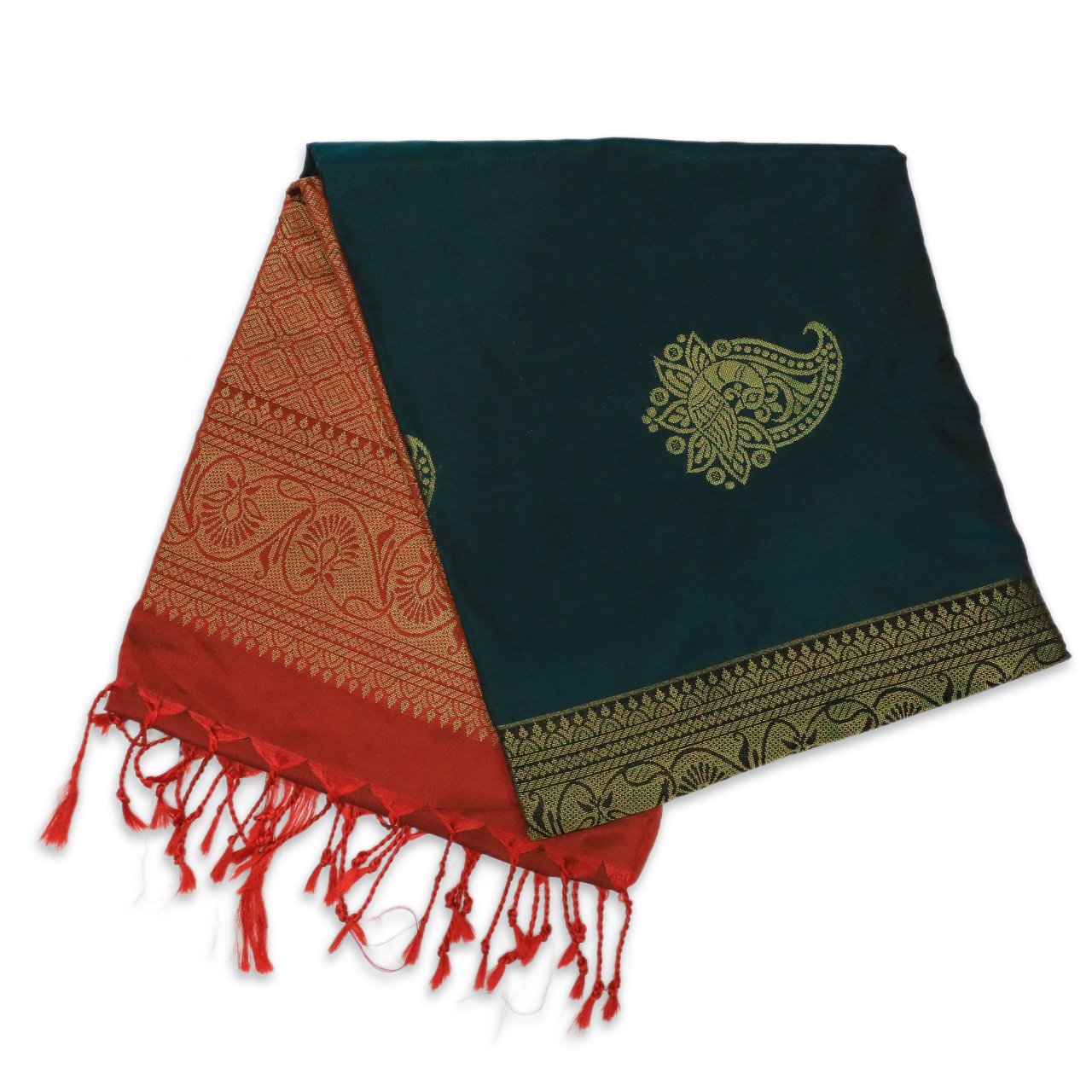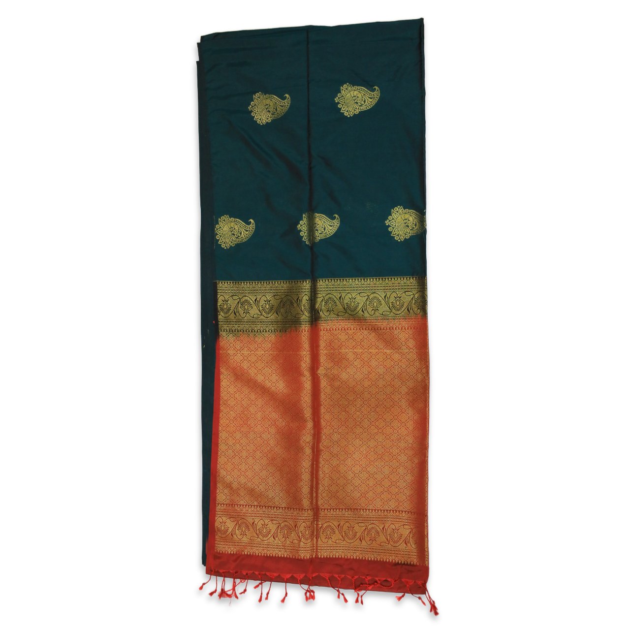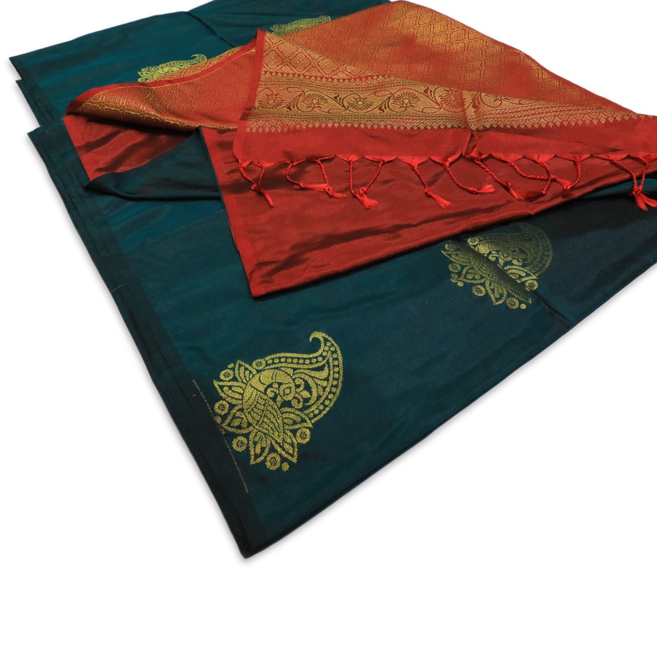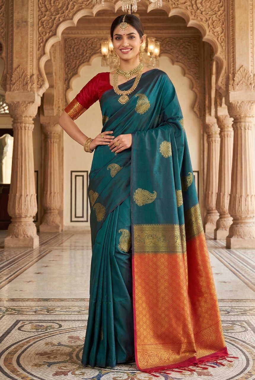 | Color | Deep Bottle Green with Rich Brick Red Brocade Pallu |