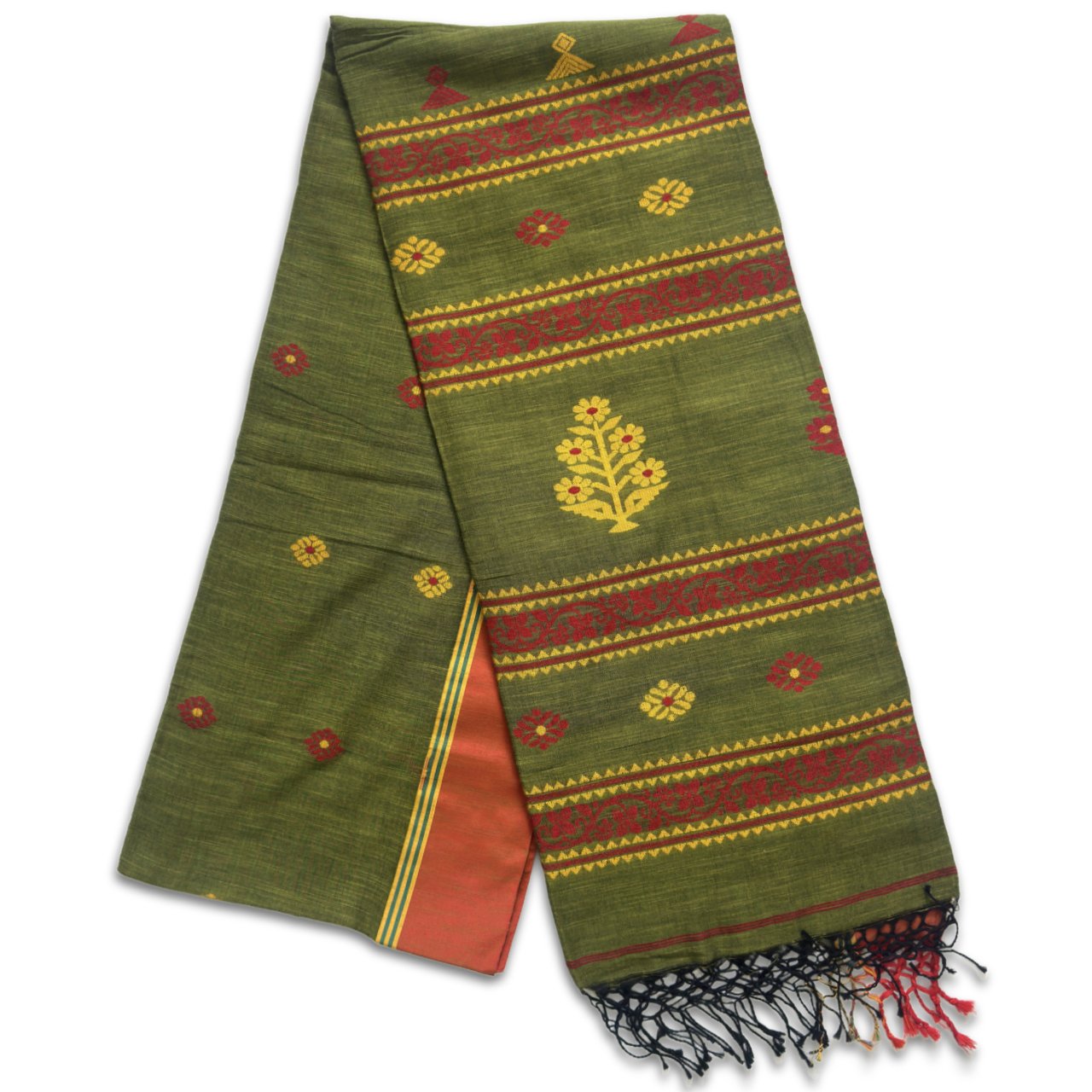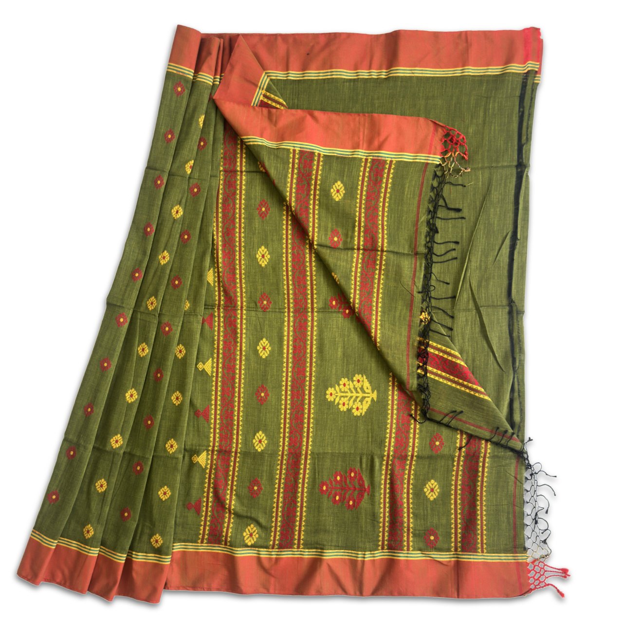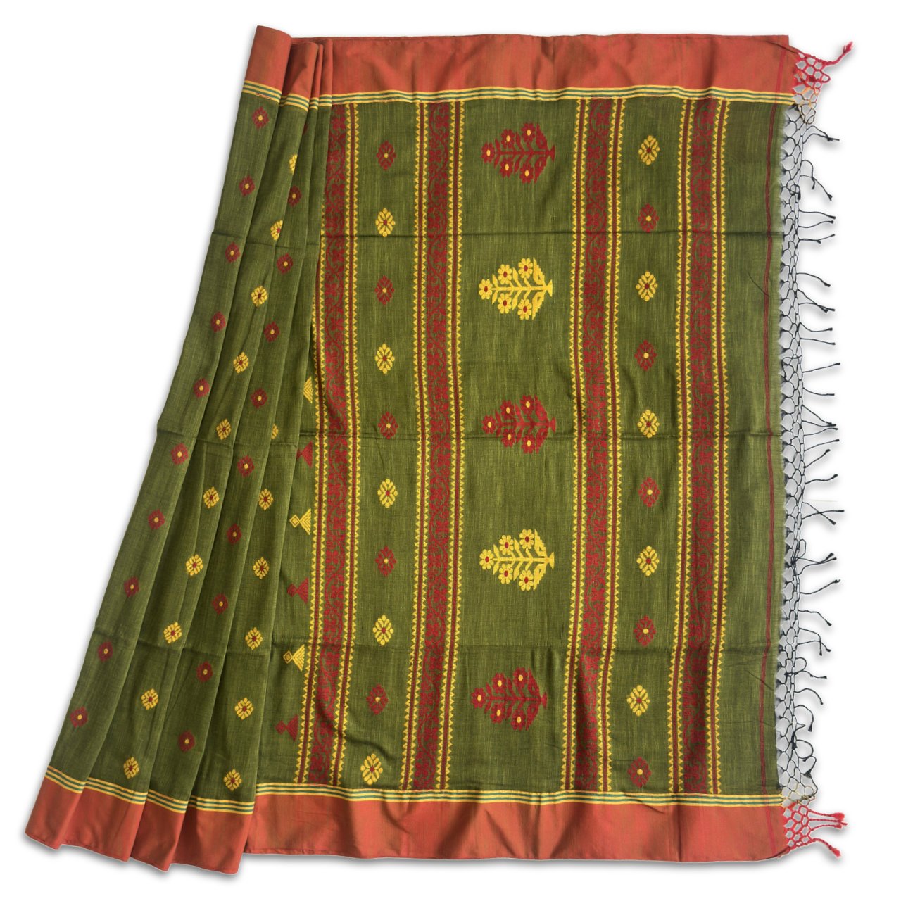 Earthy olive-green saree with geometric pattern motifs in soft yellow and deep reddish orange hue in horizontal pattern giving elongated look to pleates. Saree framed in rust orange contrast border giving subtle definition to saree and charismatic color combination. Pallu having geometric motifs and flower motifs in between rust orange grid ending with hand made tassels.