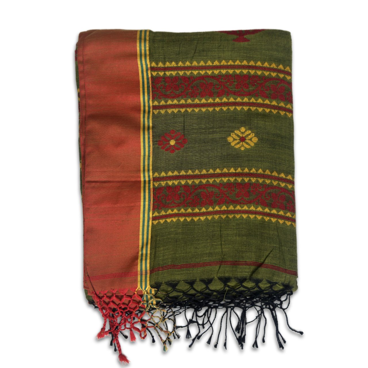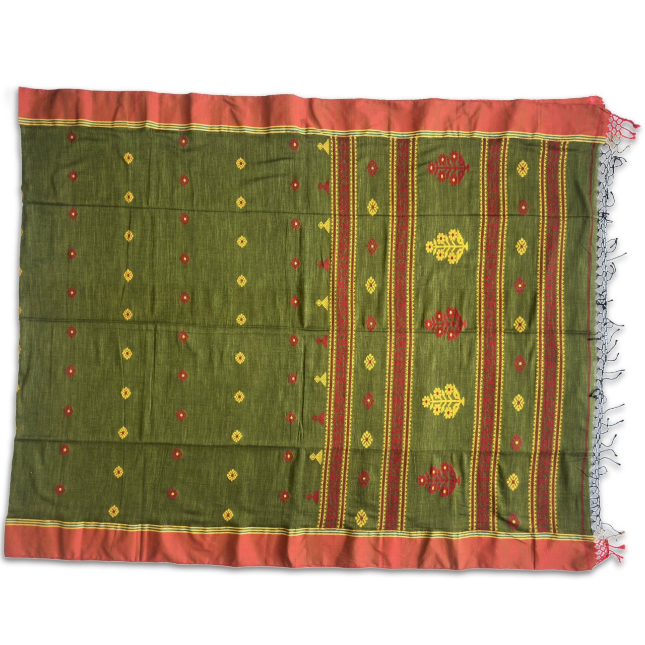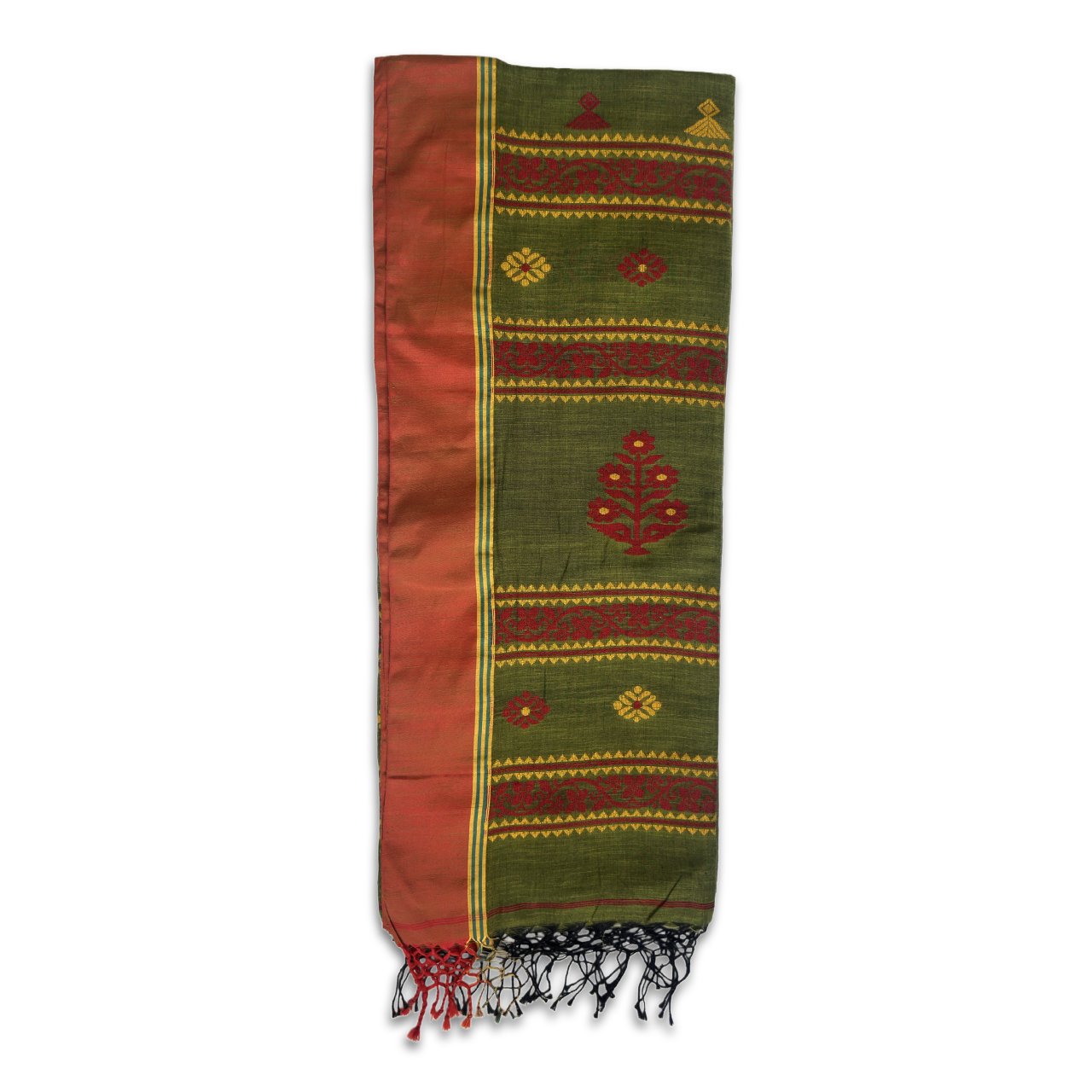 Earthy olive-green saree with geometric pattern motifs in soft yellow and deep reddish orange hue in horizontal pattern giving elongated look to pleates. Saree framed in rust orange contrast border giving subtle definition to saree and charismatic color combination. Pallu having geometric motifs and flower motifs in between rust orange grid ending with hand made tassels.