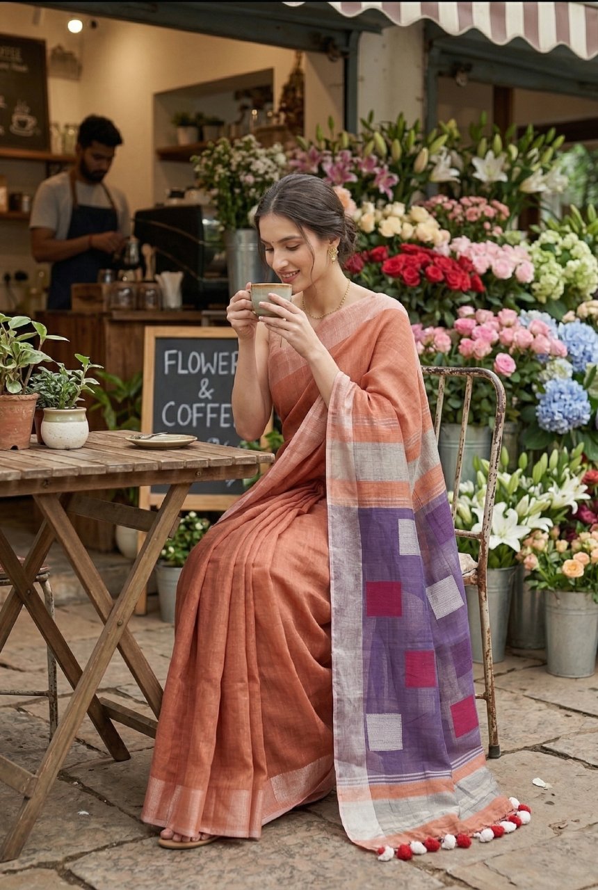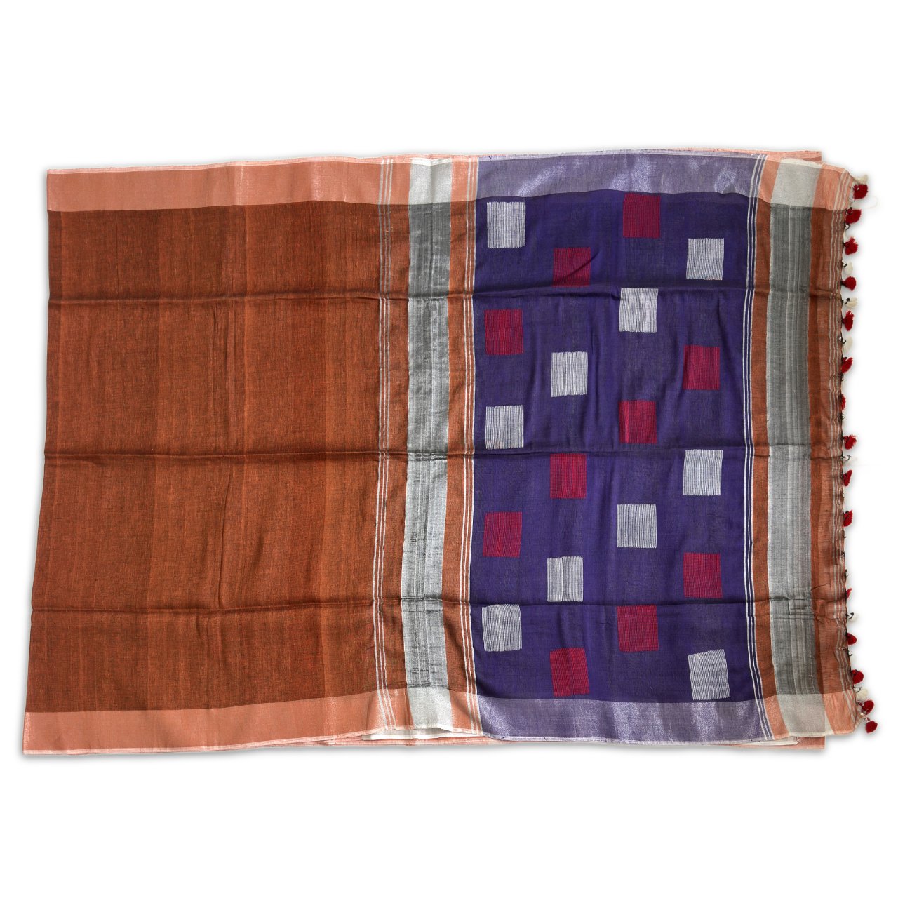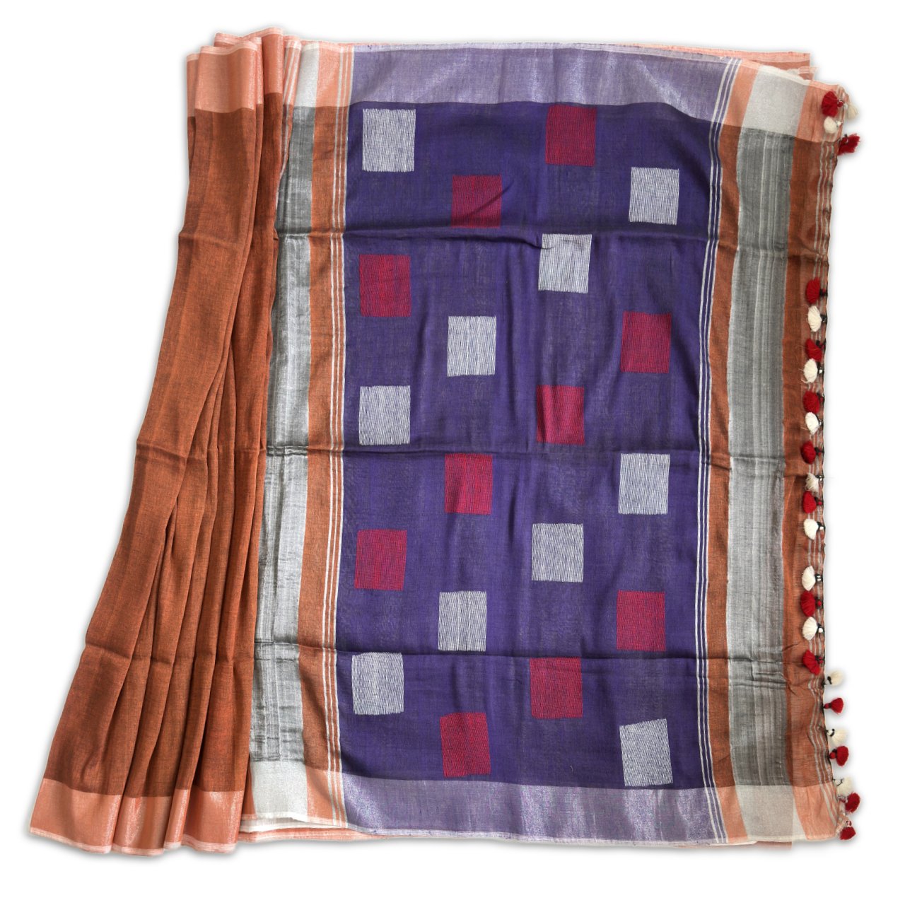Very new color combination palette a antique copper body of saree with very subtle sheen and warmth adding grace, subtle purple bluish pallu with geometric figurine in self-weave in red and grey square shapes placed meticulously with grey stripes transitioning body of saree into pallu. And pallu with beautiful red and grey hand tied tassels giving a aristocratic look and a opulent sense of dressing.