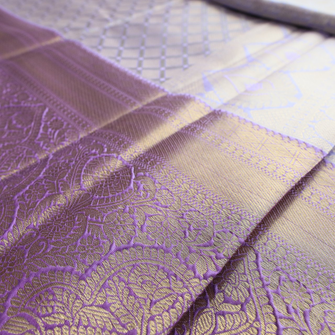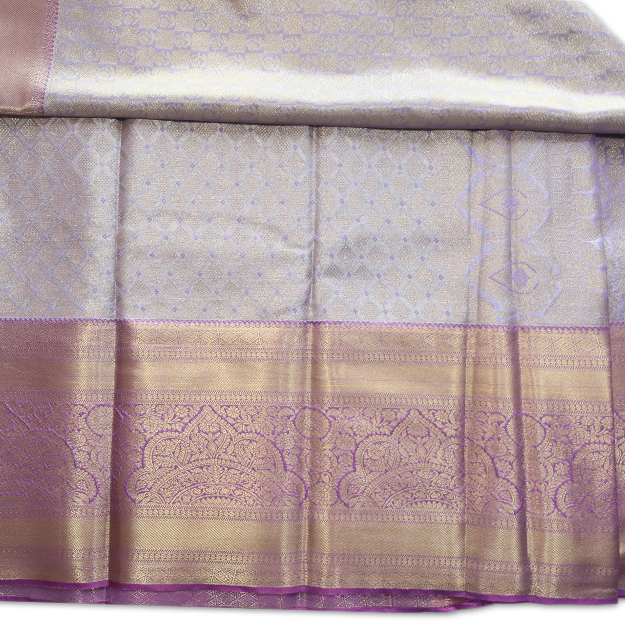Kanchipuram self-design saree with body reflecting lavender hue enriched with rich and refined geometric pattern subtly highlighted with tiny blush tone in most detailed pattern and a show of fine artistry.