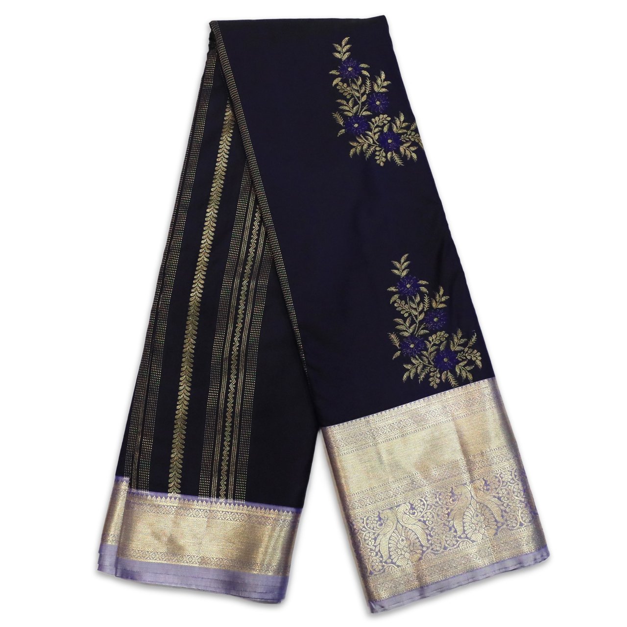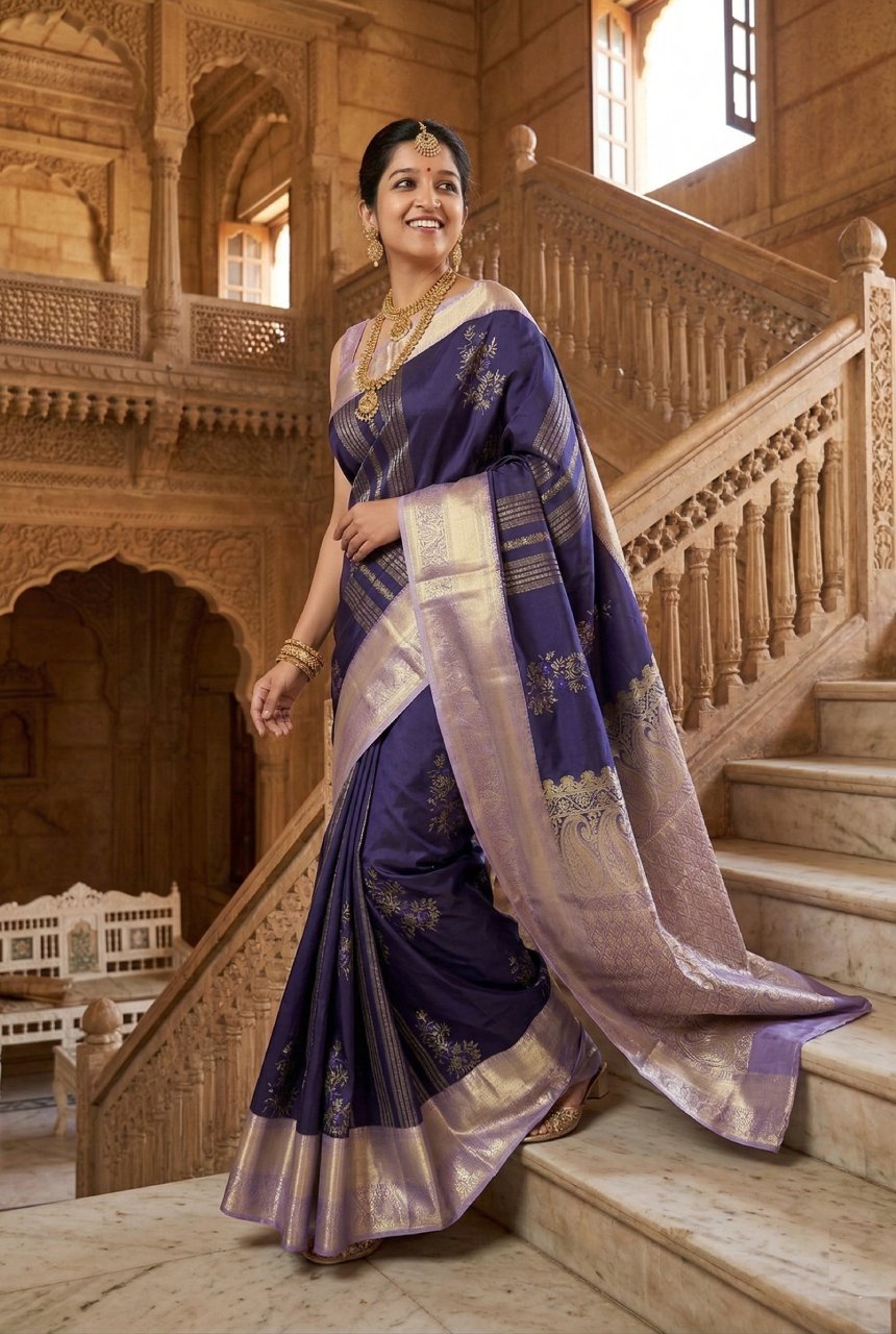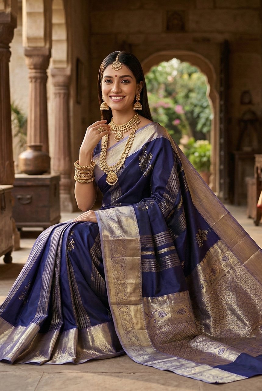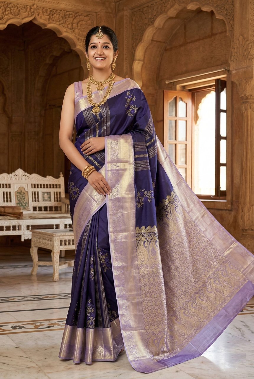 Navy Blue Motifs & Vertical Zari Saree