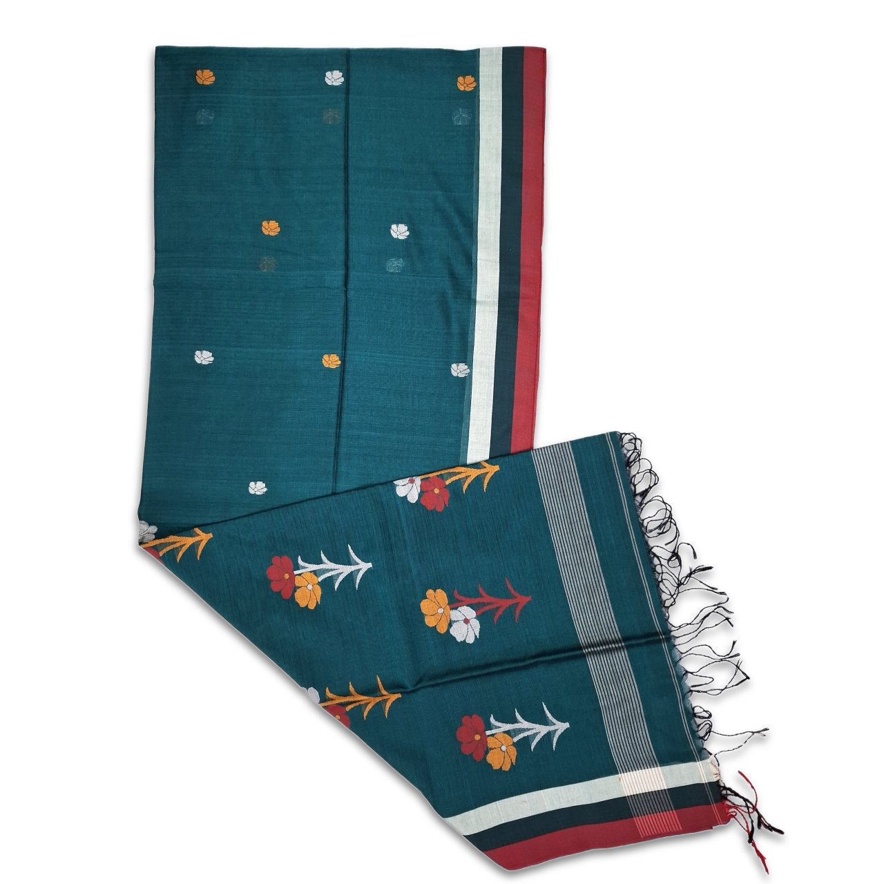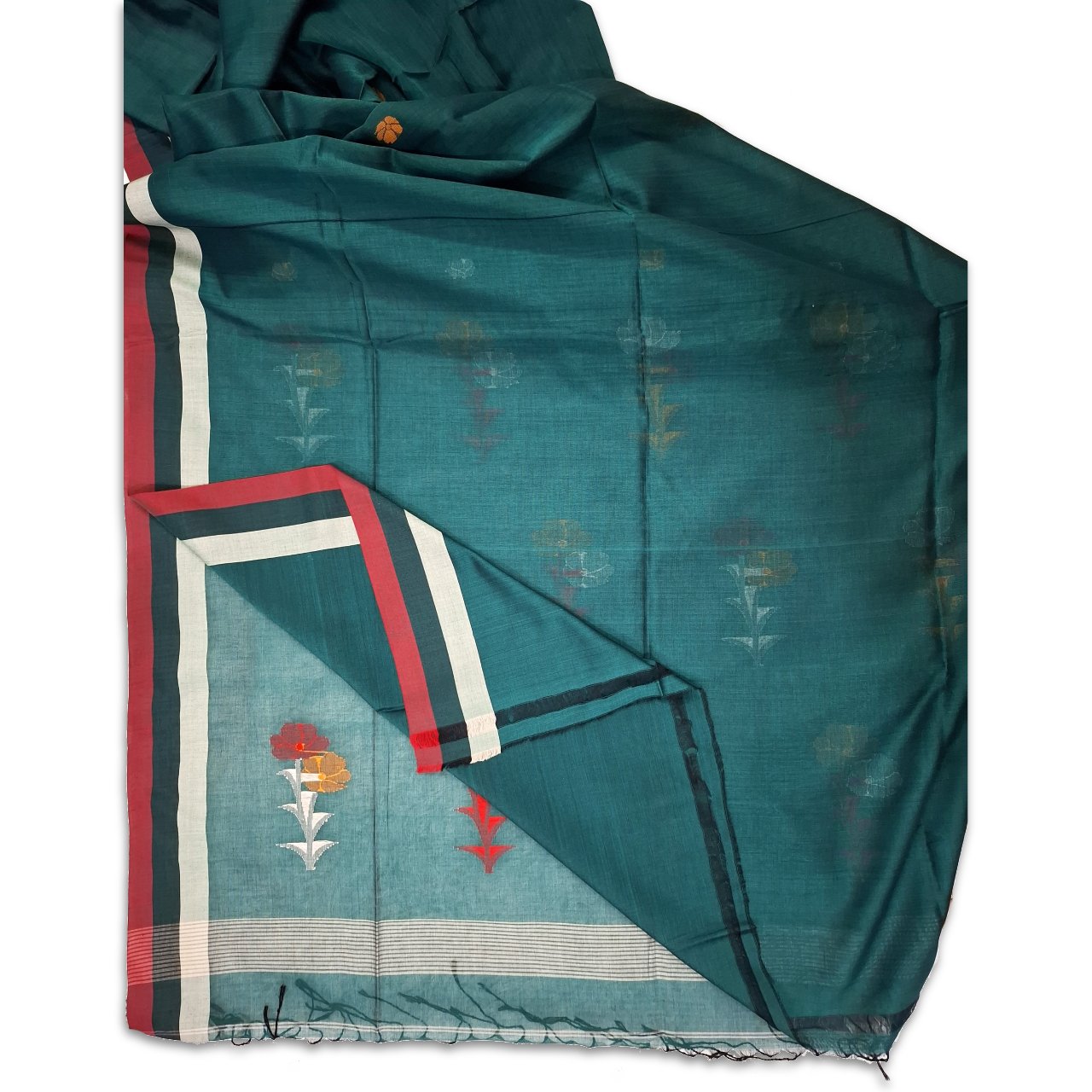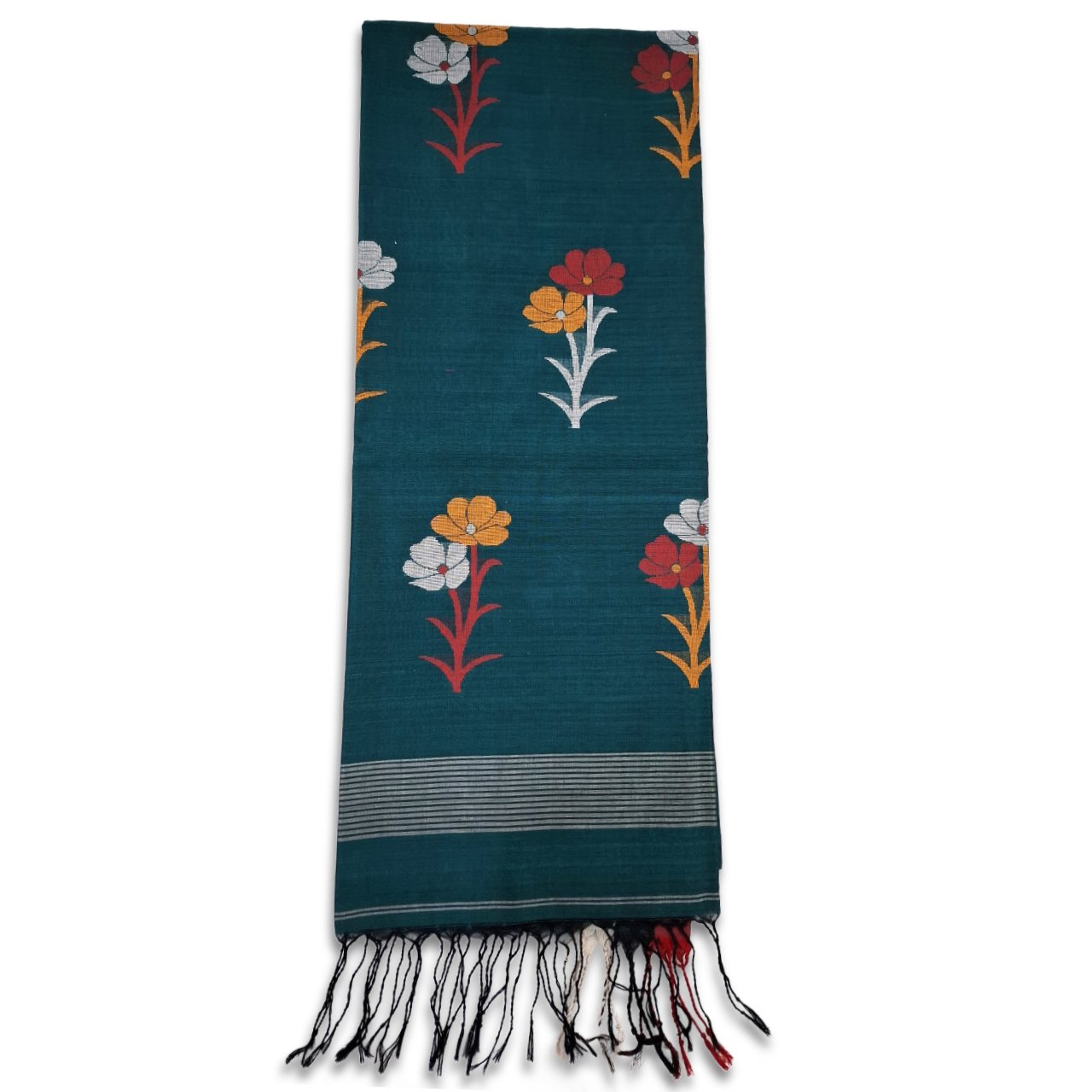 Dark green soft cotton saree having small ivory and golden yellow motifs on base, red green ivory silver stripes on borders and big red, yellow, ivory grey flower motifs on pallu adorned with beautiful tassels on pallu.