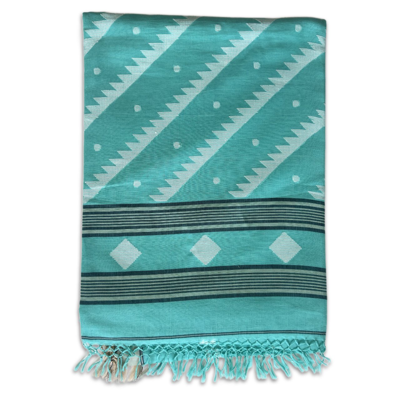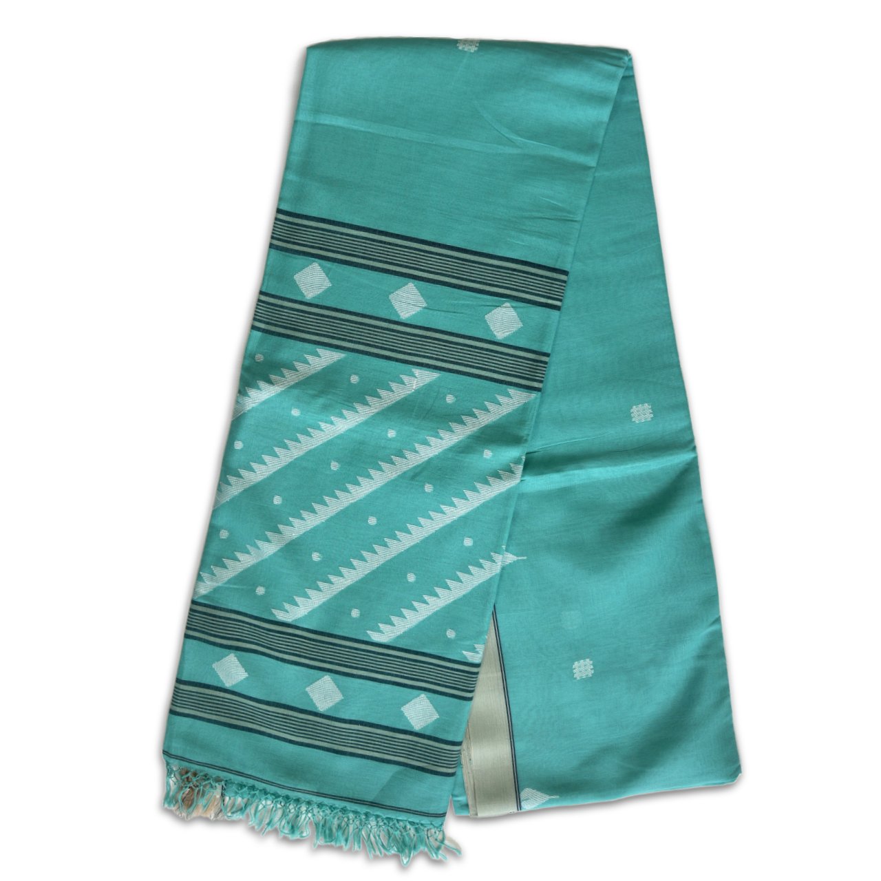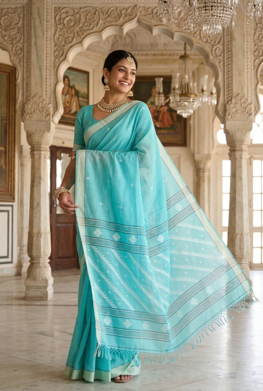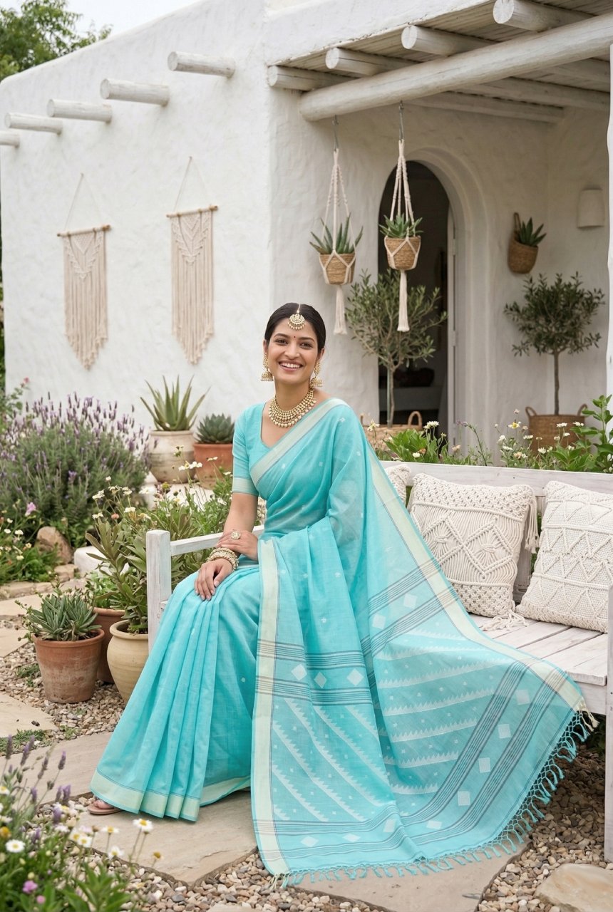 Sea green base gives a fresh and new vibe with small woven motifs giving minimal aesthetic look. Pallu stands out with distinct diagonal geometric patterns and diamond shaped motifs ending with handmade tassels making it effortlessly elegant and versatile.