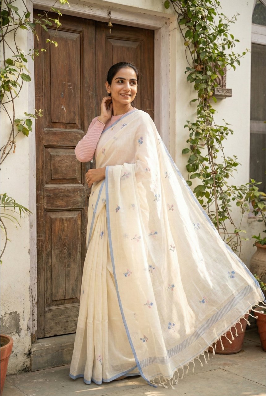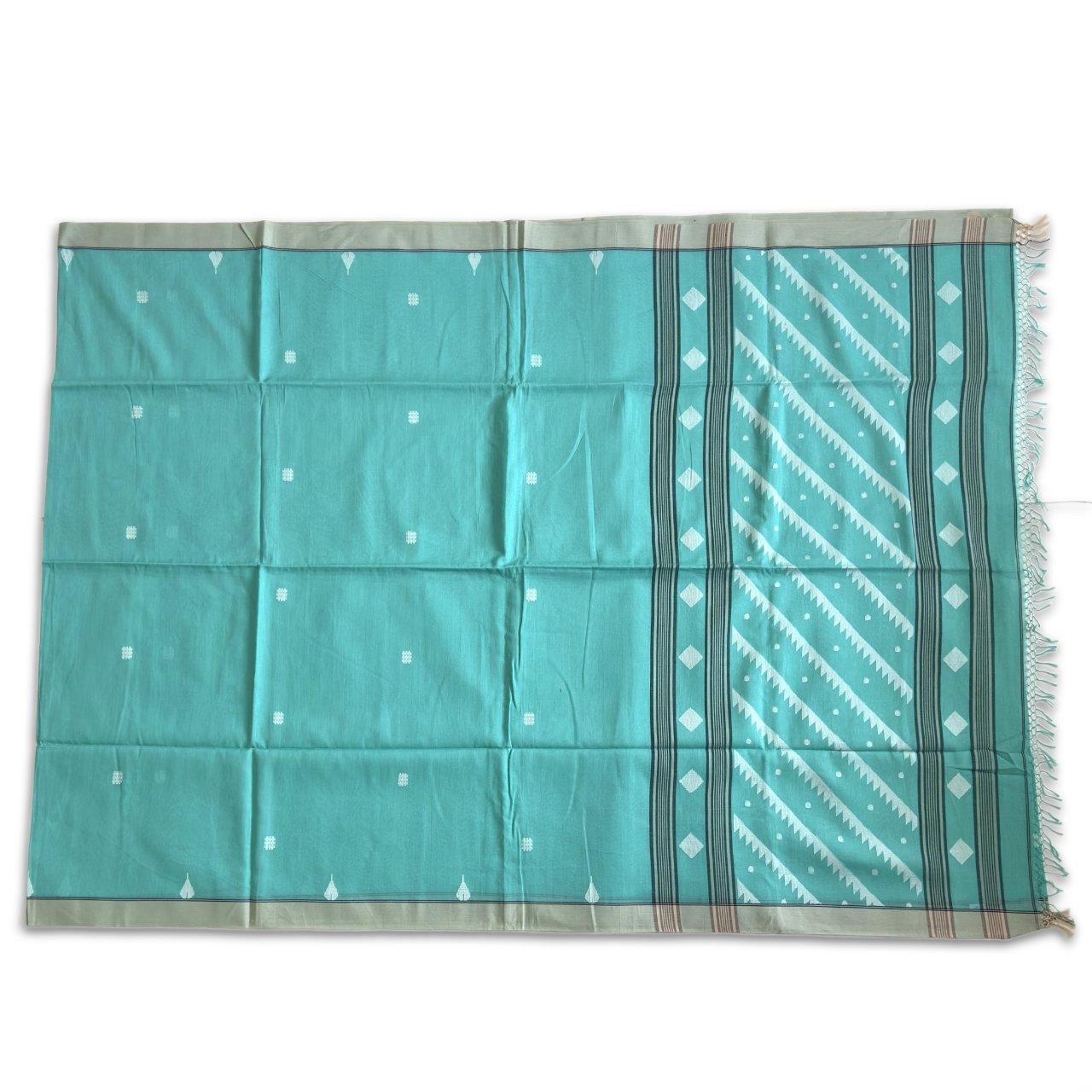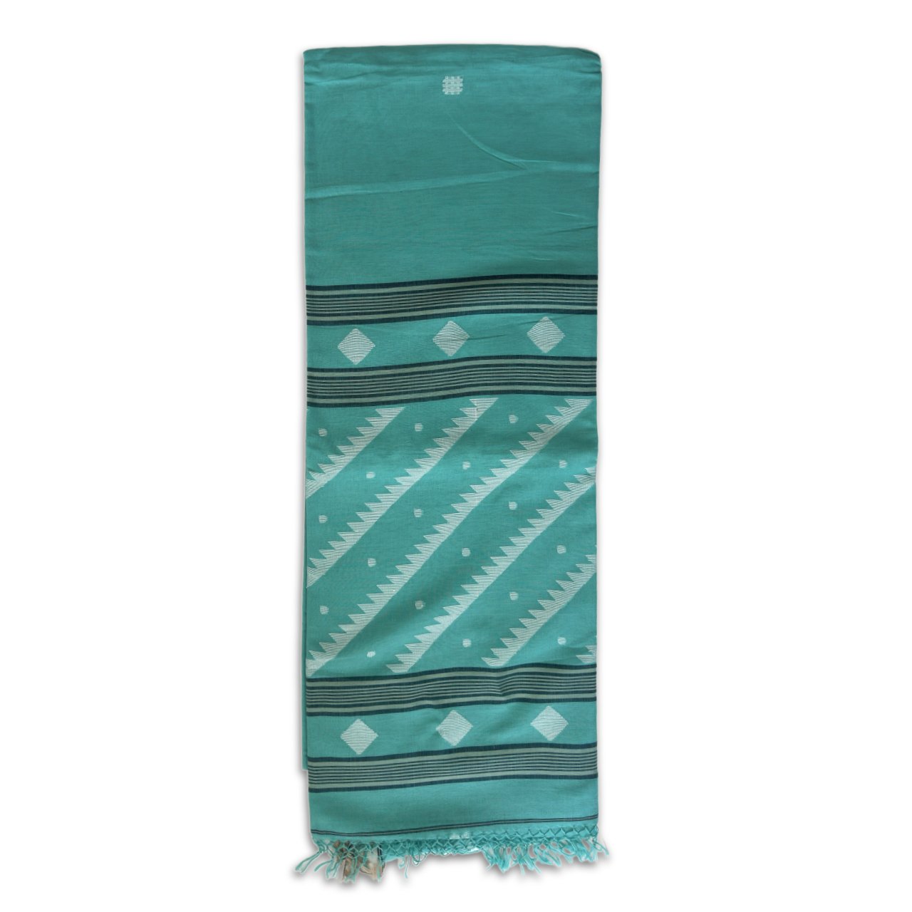 Sea green base gives a fresh and new vibe with small woven motifs giving minimal aesthetic look. Pallu stands out with distinct diagonal geometric patterns and diamond shaped motifs ending with handmade tassels making it effortlessly elegant and versatile.