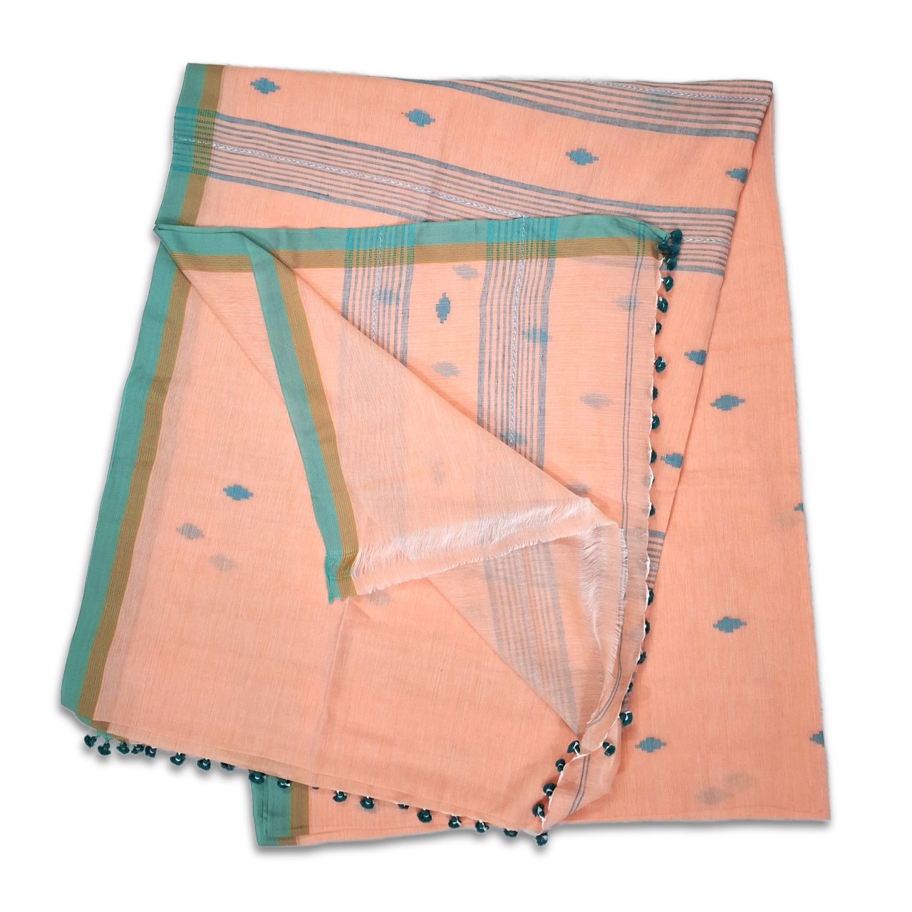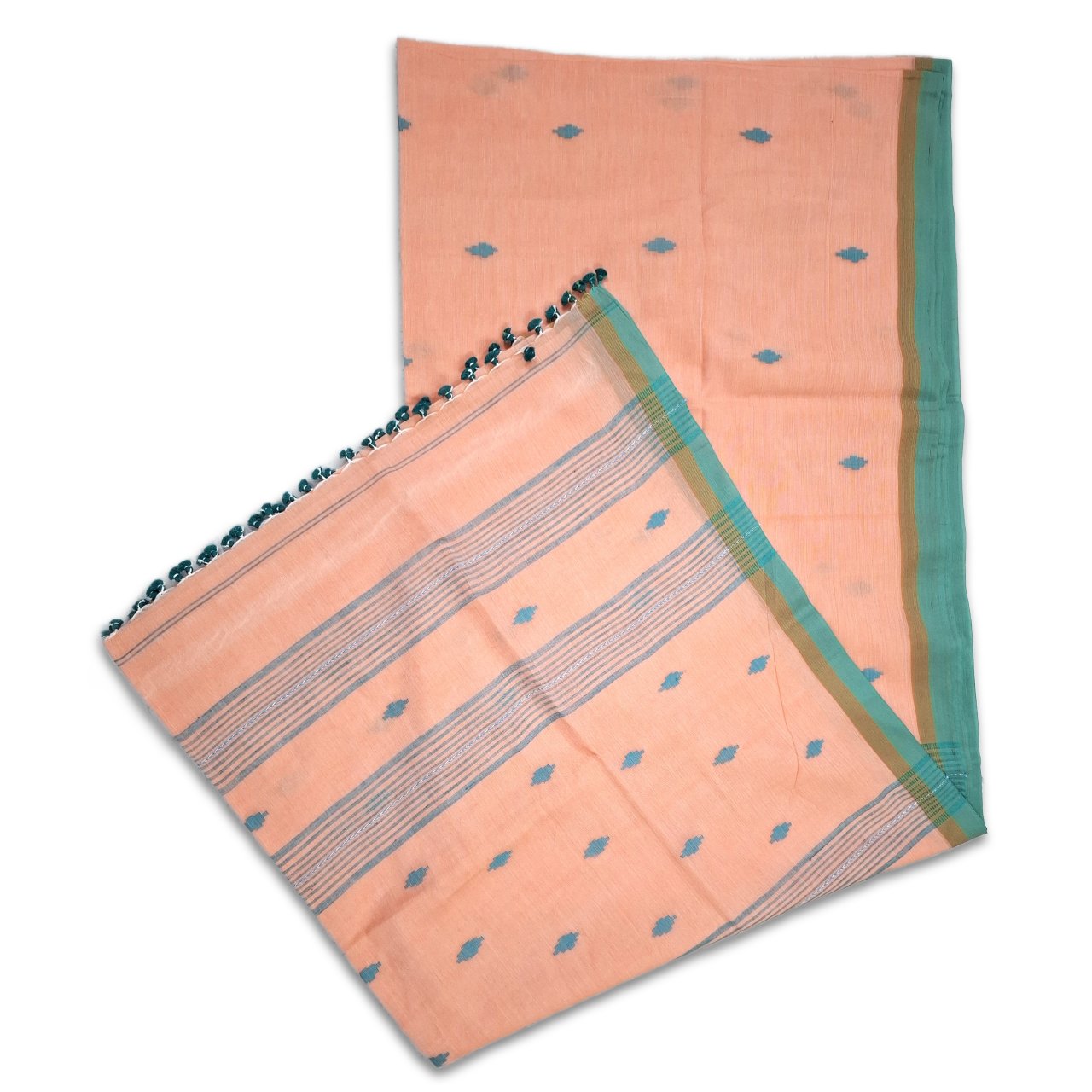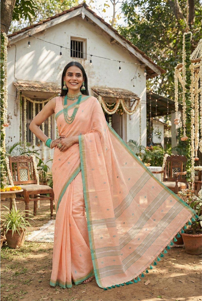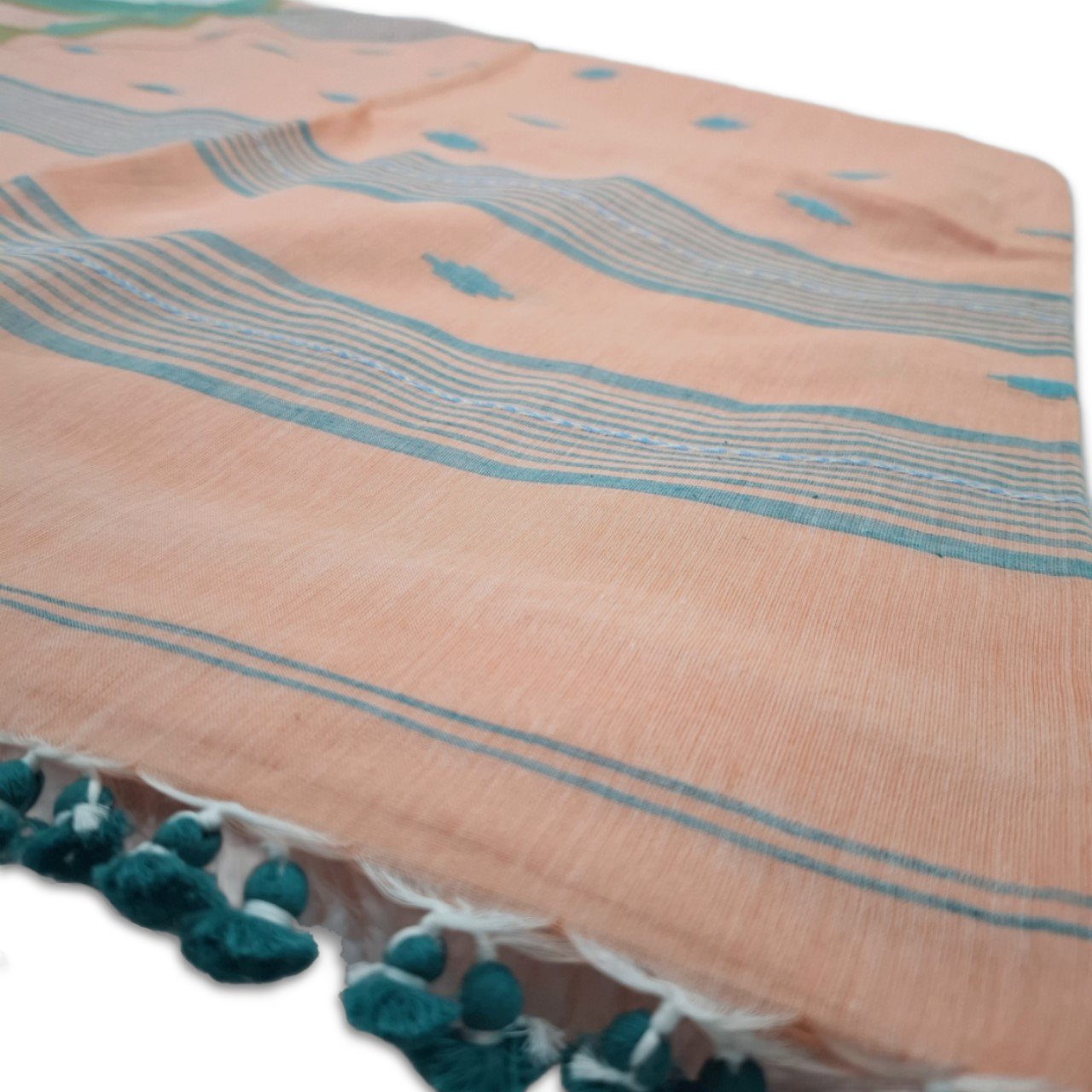 Peachy teal saree with peach colored body adorned with woven teal motifs in body. Pallu and border have teal fine striped detailing and hand-crafted tassels on pallu. It is an elegant masterpiece with unique colors and dreamy aura, pastel color combination and fine cloth stands out and gives a classy feel.
