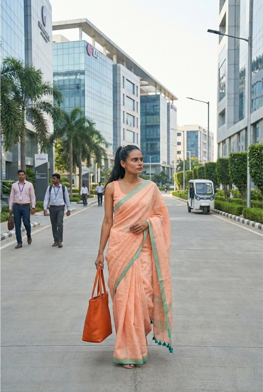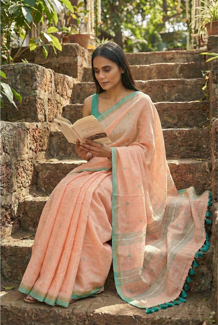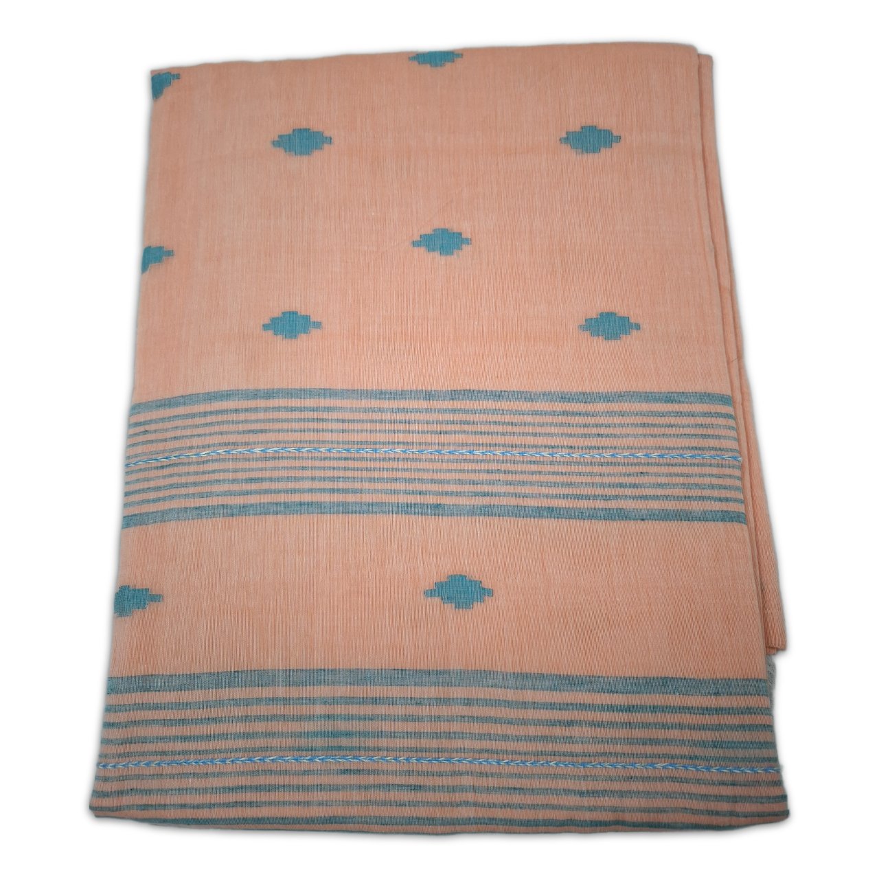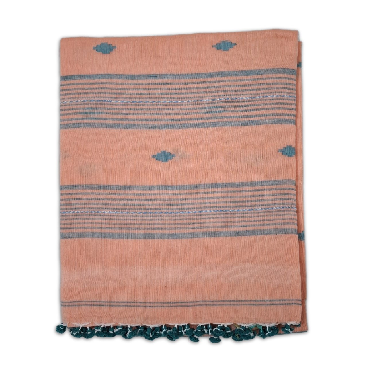 Peachy teal saree with peach colored body adorned with woven teal motifs in body. Pallu and border have teal fine striped detailing and hand-crafted tassels on pallu. It is an elegant masterpiece with unique colors and dreamy aura, pastel color combination and fine cloth stands out and gives a classy feel.