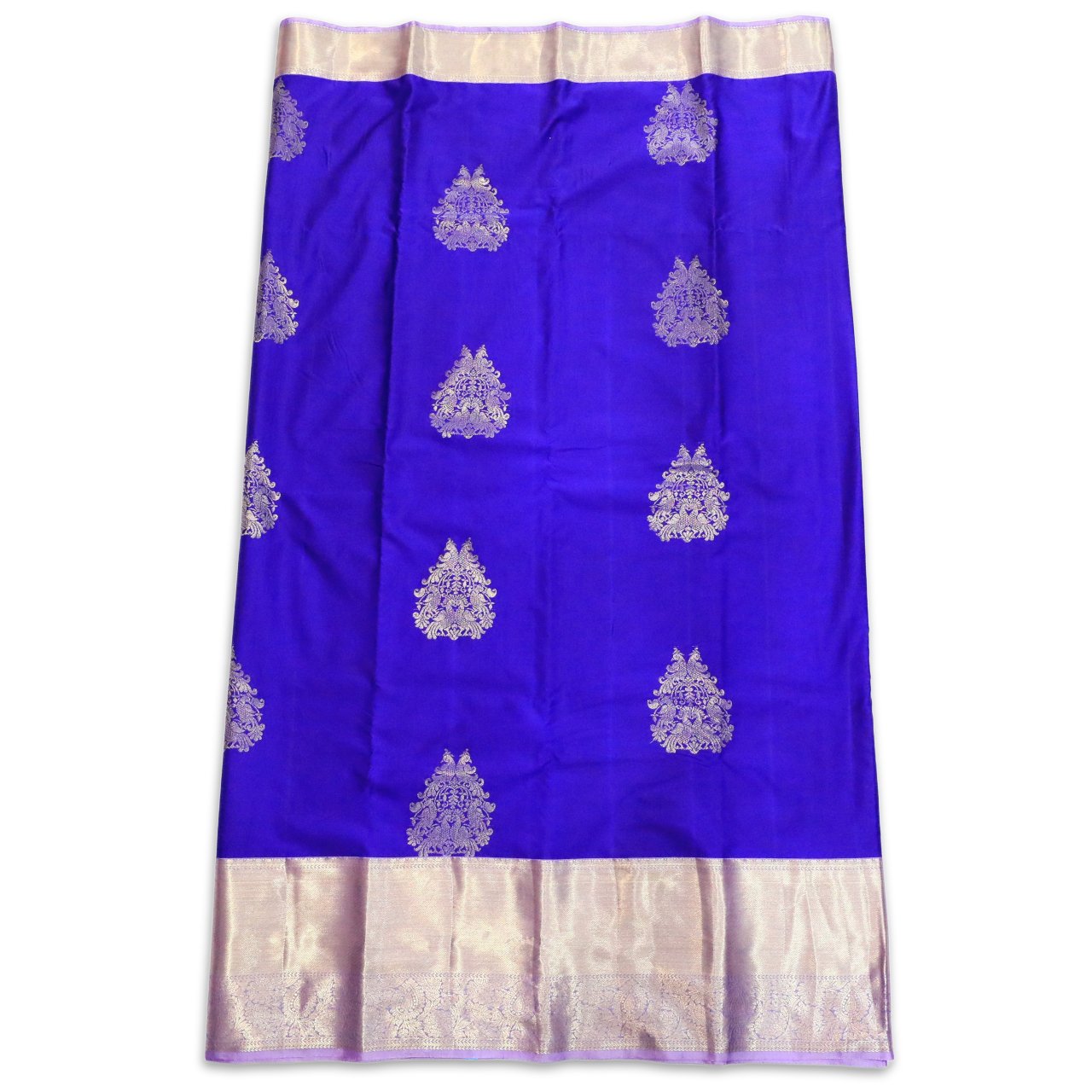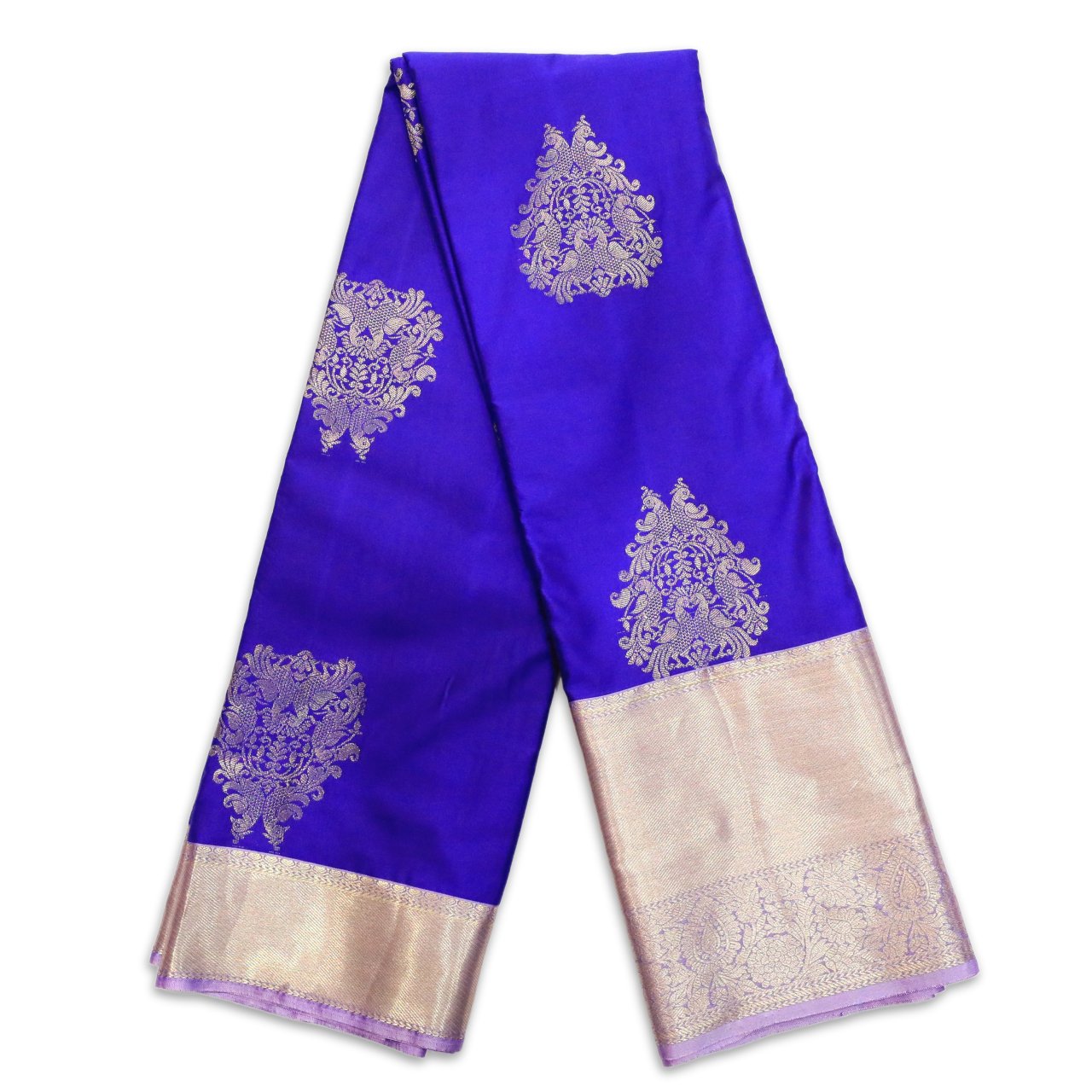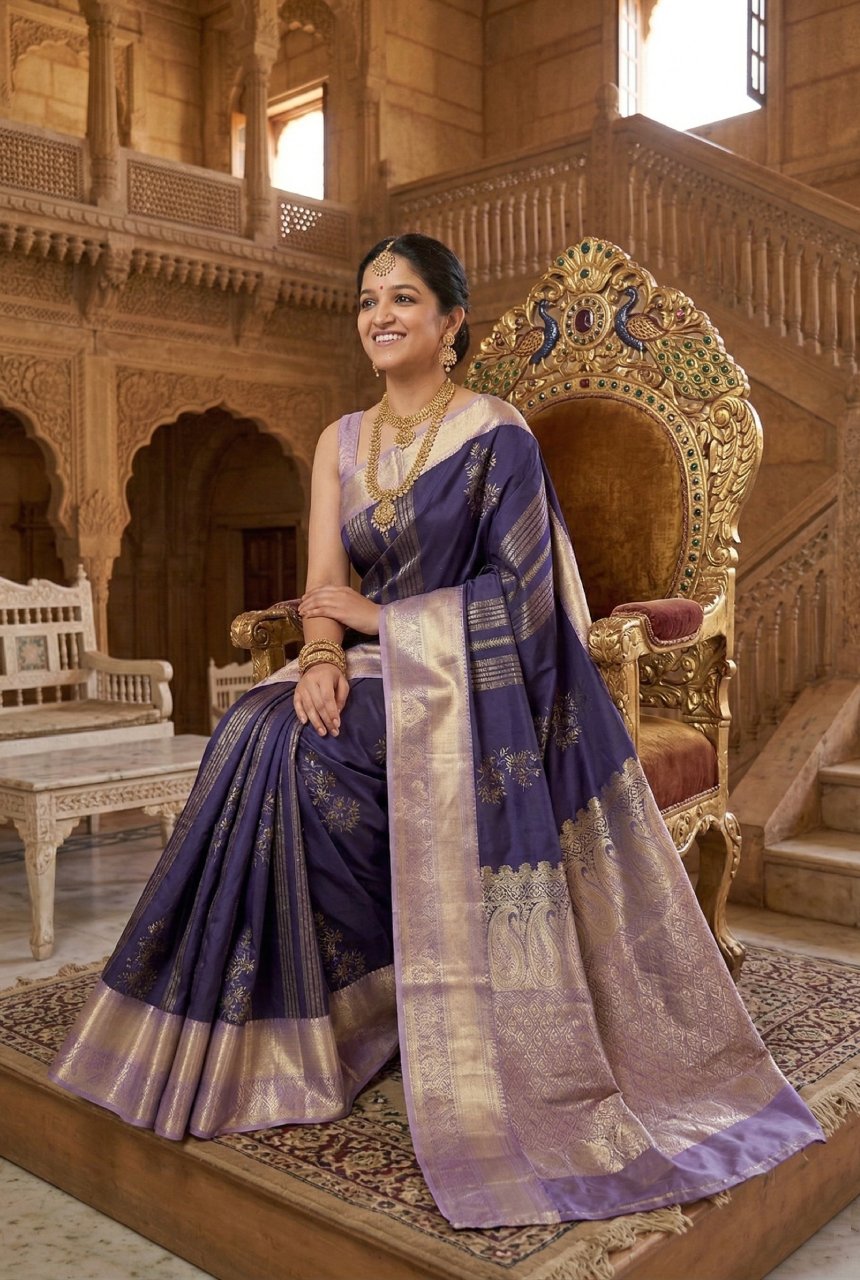 It’s a saree of rich color palette. Body of saree in royal blue tone creating a bold yet graceful canvas with finely woven motifs inspired from empress throne with peacocks on all sides making it an exquisite of craftsmanship. Border and pallu are in luminous pale gold Zari with ornamental motifs creating a quiet contrast with body making it soothing combination. It has traditional patterns with floral and ornamental detailing with violet selvedge giving it a outstanding look.