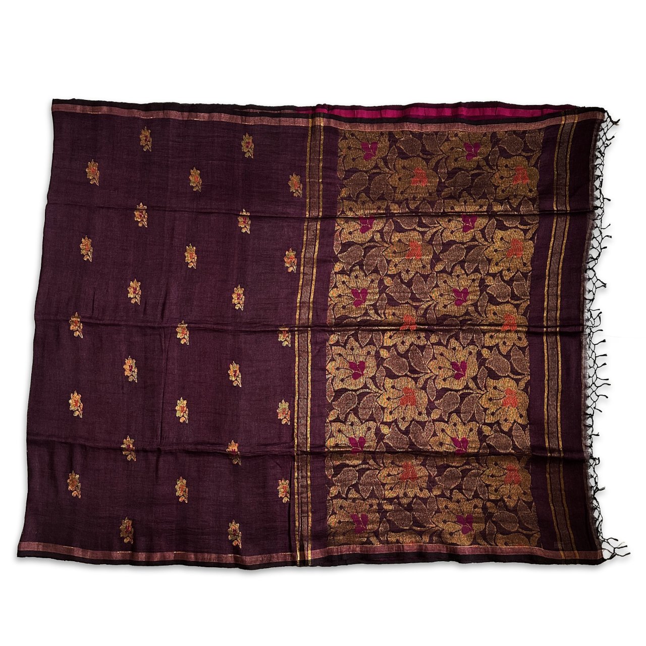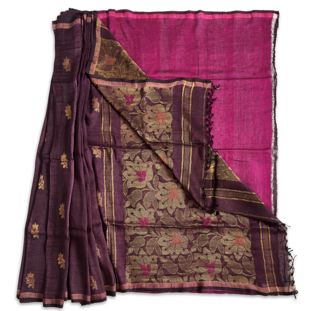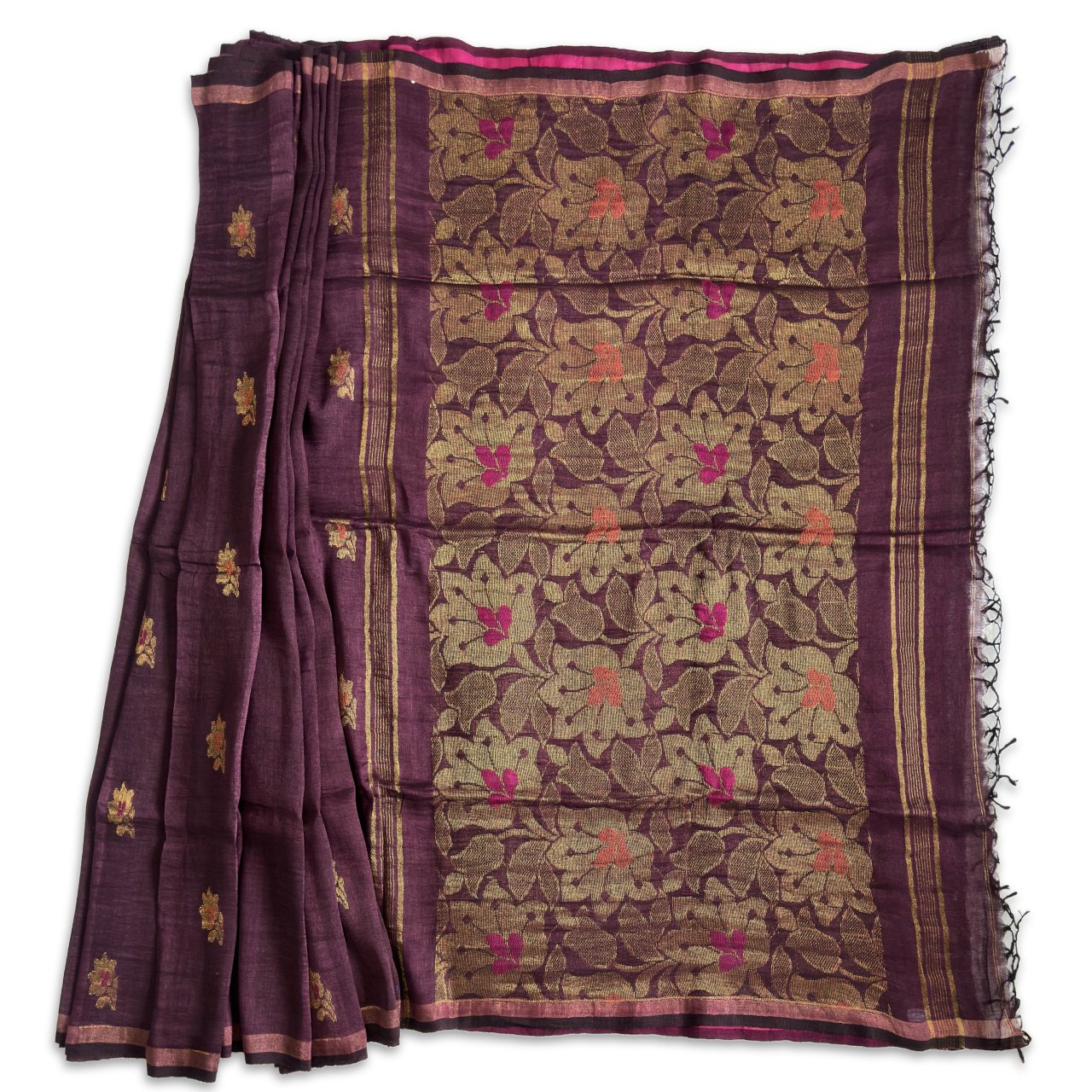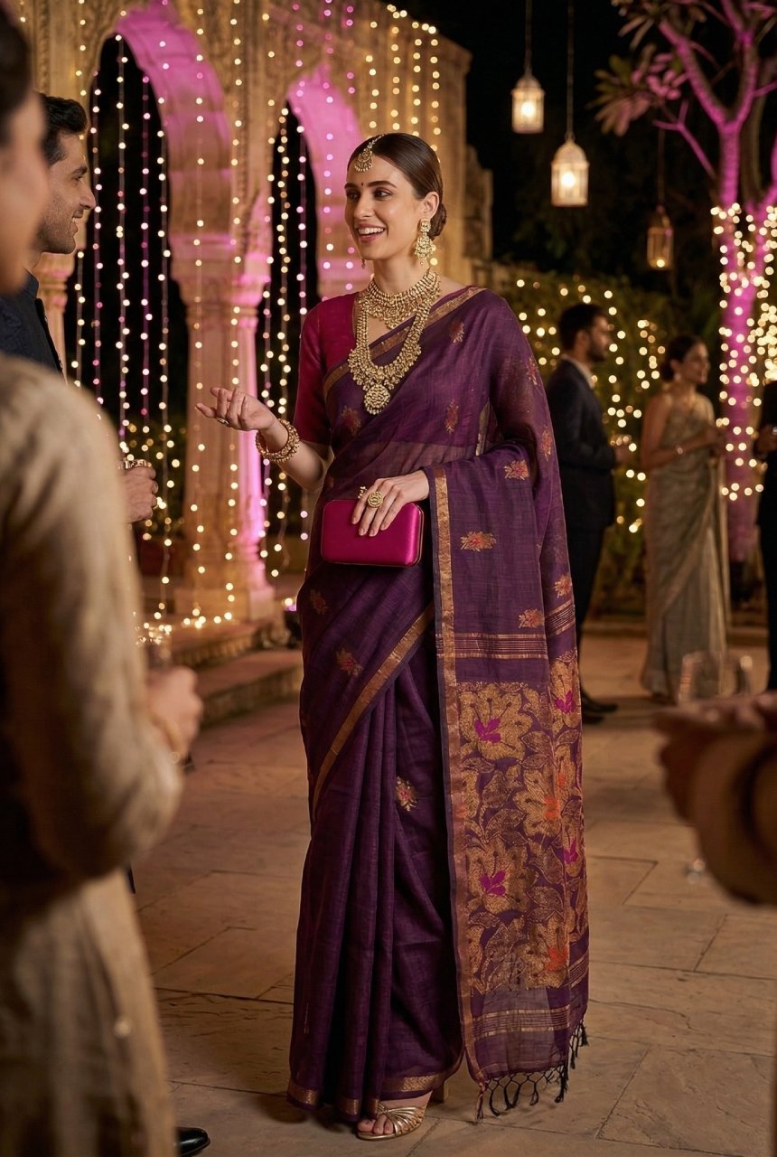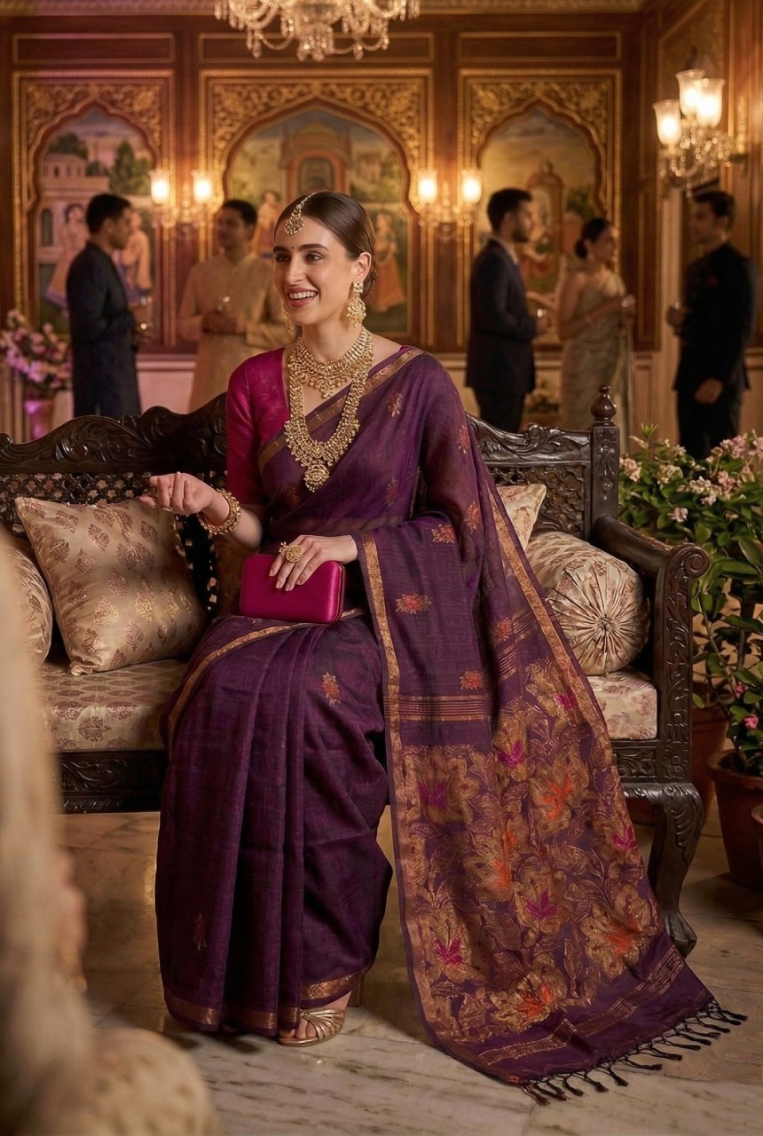 Never seen before Zari work laden linen saree that makes it very regal and its drape looks absolutely awe struck. It’s a very lite color and will look classy in both day and night, redefining your looks and enhances your persona by adding a classy regal charm to your collection.