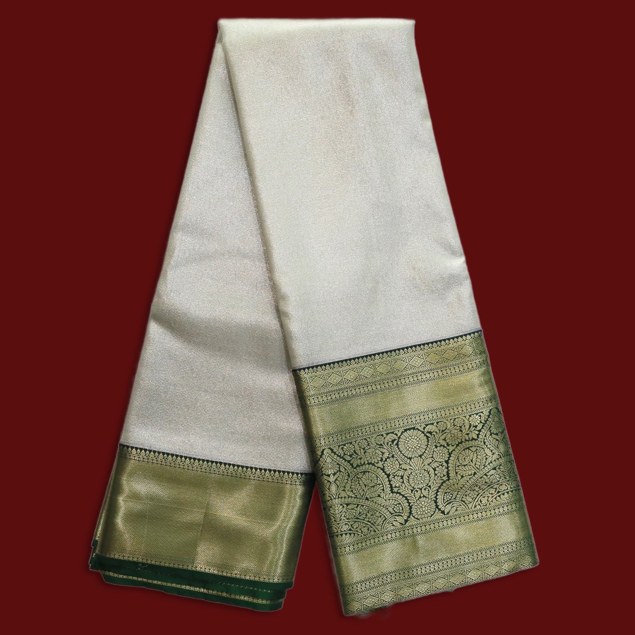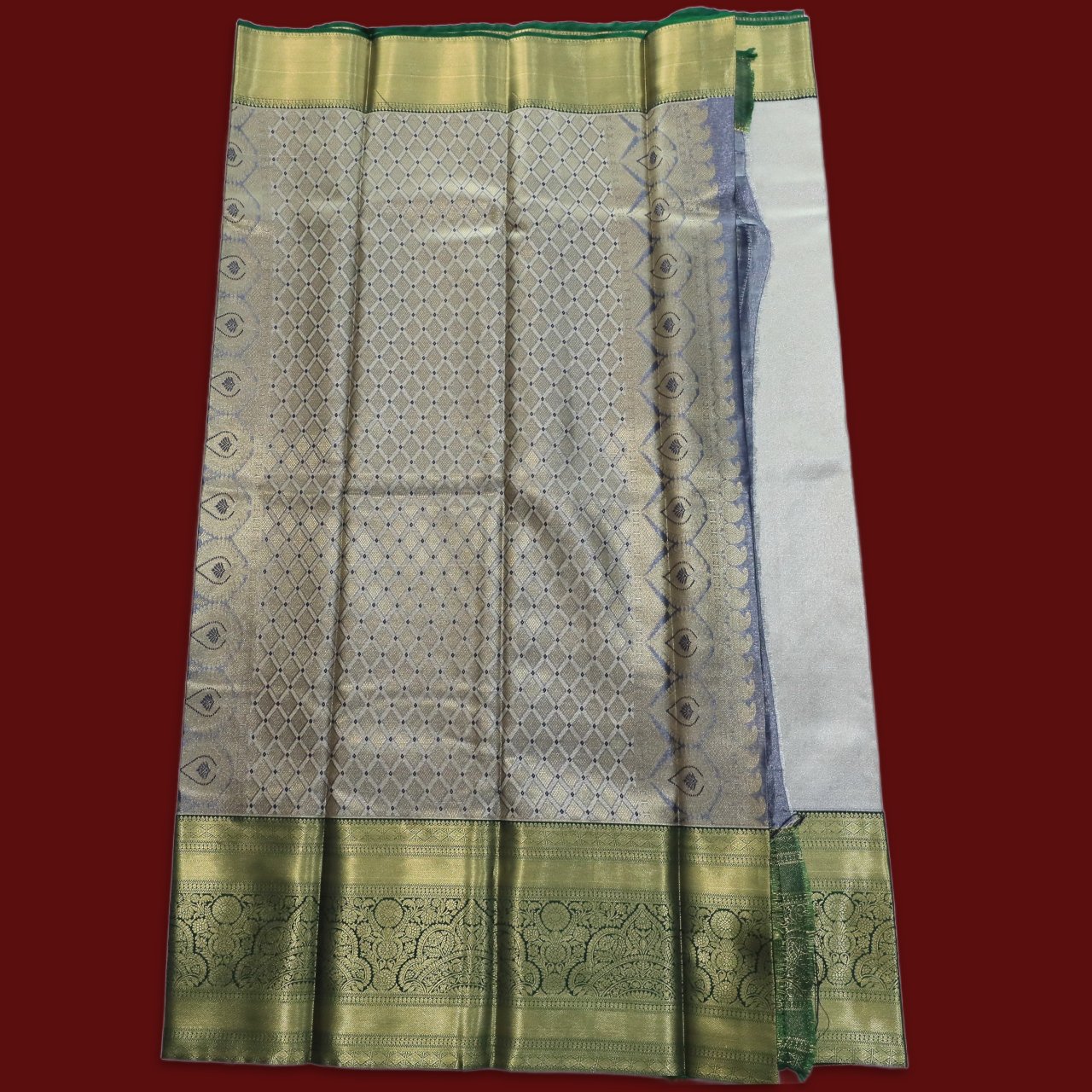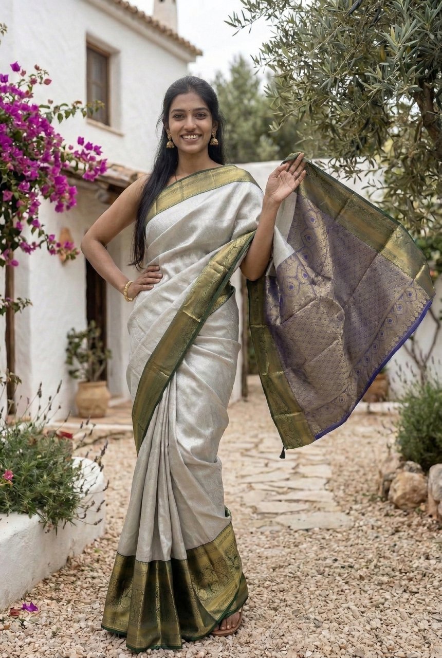 | Color | Soft Silver Grey with Olive Green and Gold Zari Border |