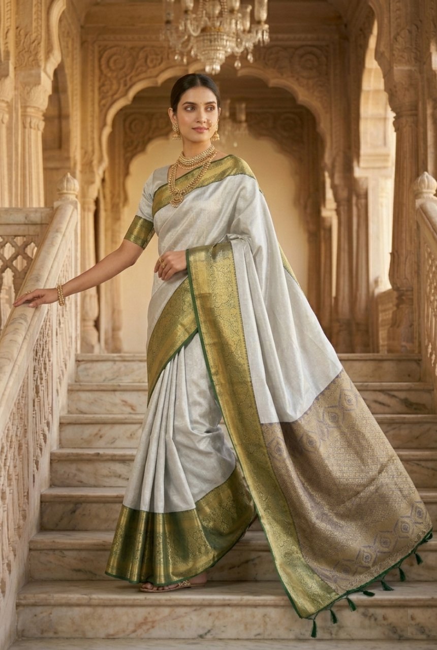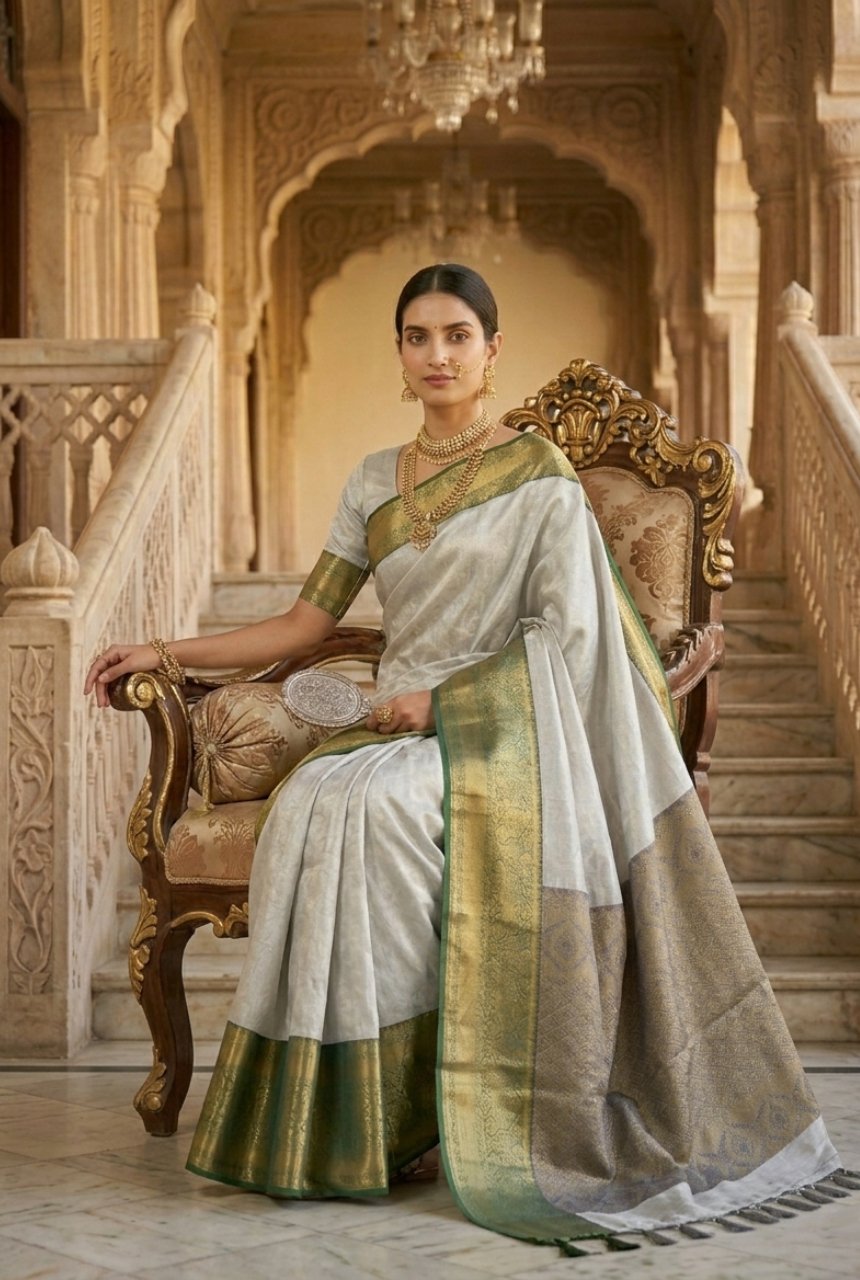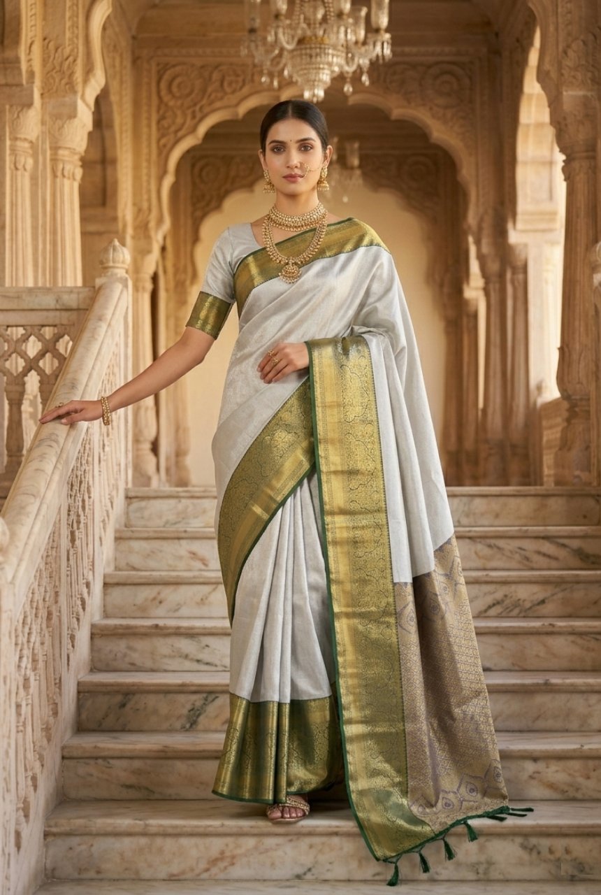 Soft metallic tone with deep jewel hues. Base has intricated self-work. Body of saree is in serene soft grey tone with a lustrous smooth finish that reflects light, a gentle sheen making it perfect for both day and night wear. The broad border is richly contrasted in deep forest green woven with delicate floral design in queens crown inspired motifs giving it regal fame, accented by a fine green self-edge. Pallu has diamond geometric pattern Jaal subtly interspersed.