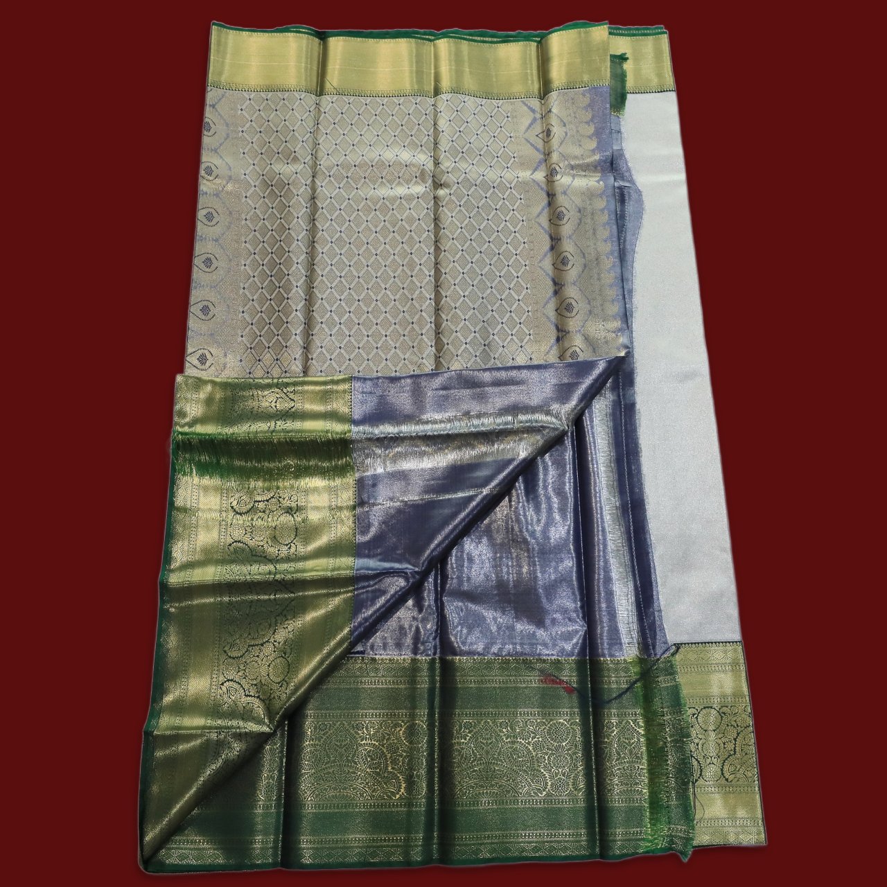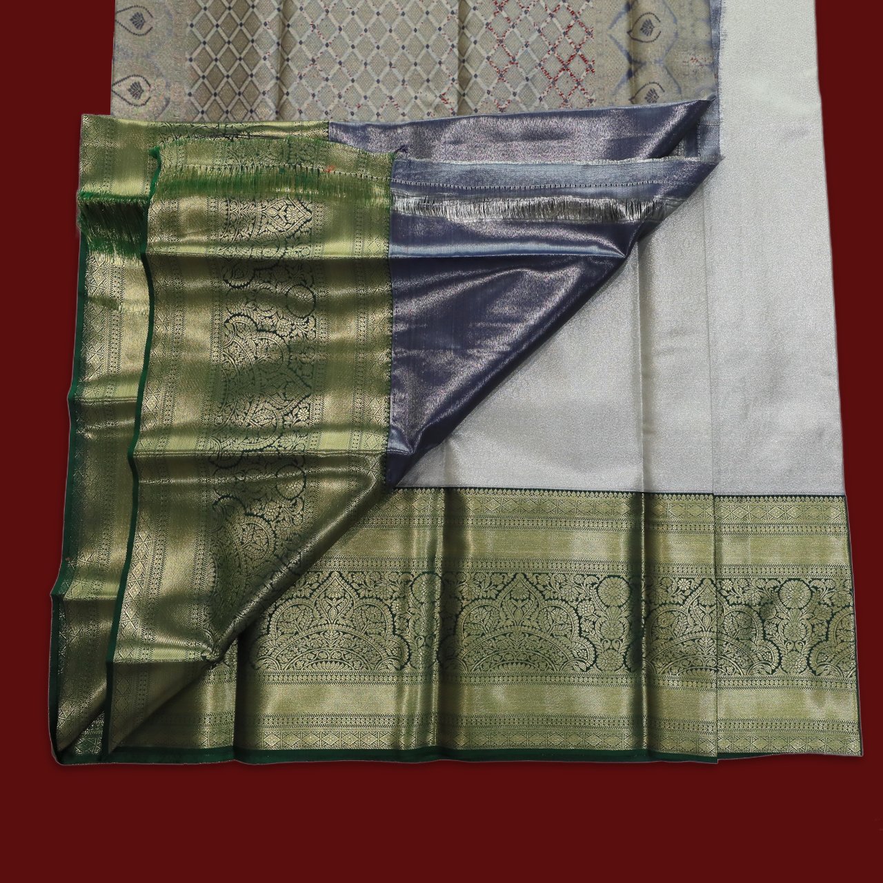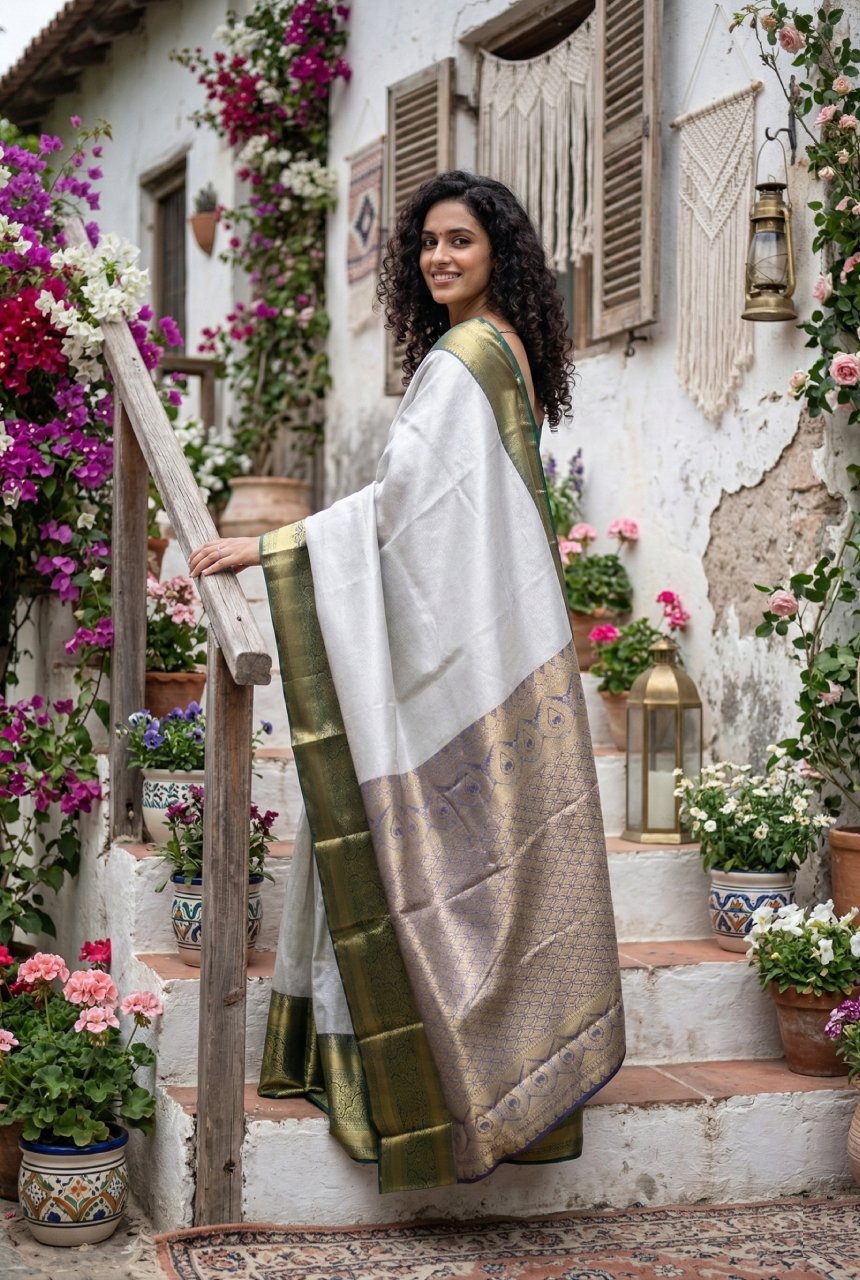 Soft metallic tone with deep jewel hues. Base has intricated self-work. Body of saree is in serene soft grey tone with a lustrous smooth finish that reflects light, a gentle sheen making it perfect for both day and night wear. The broad border is richly contrasted in deep forest green woven with delicate floral design in queens crown inspired motifs giving it regal fame, accented by a fine green self-edge. Pallu has diamond geometric pattern Jaal subtly interspersed.