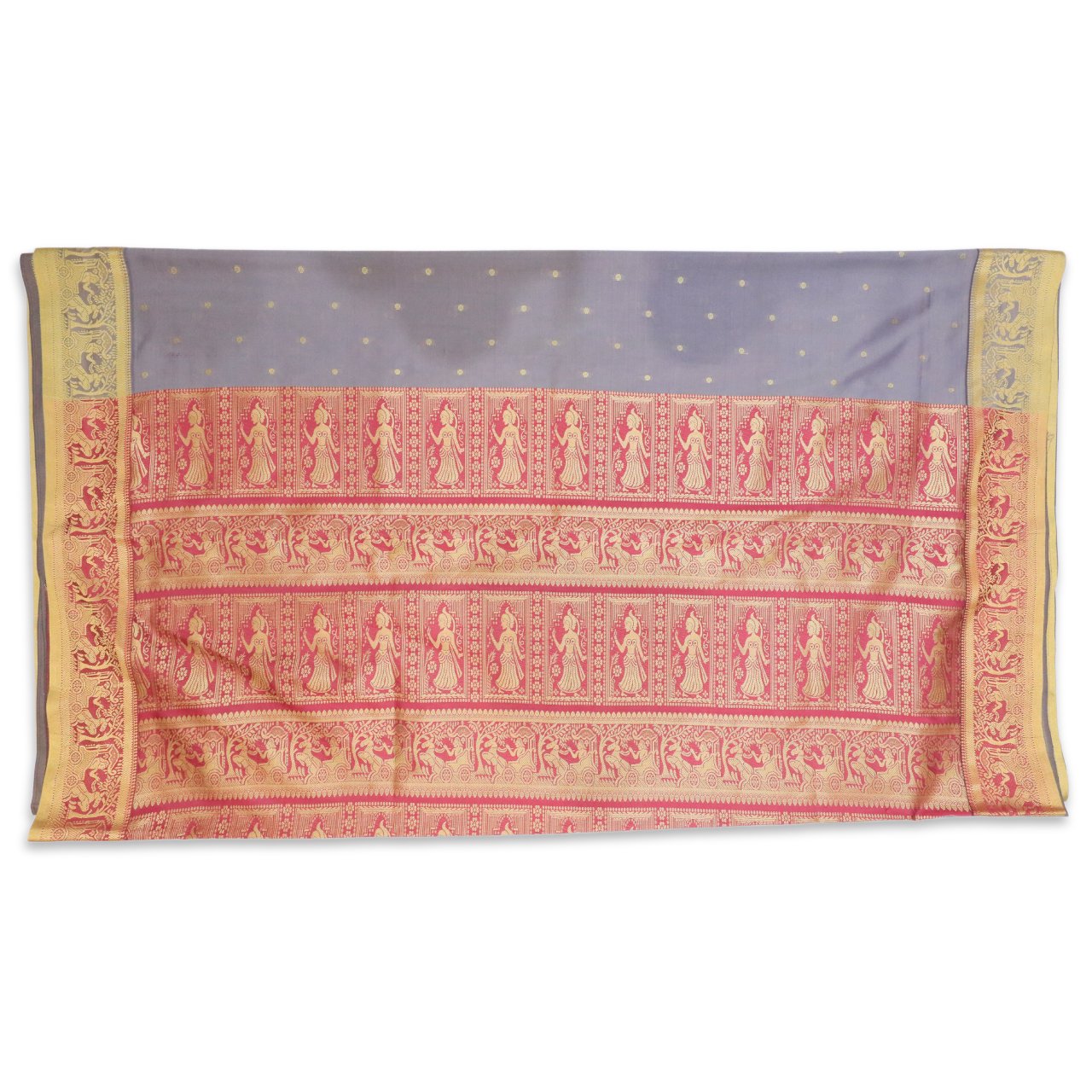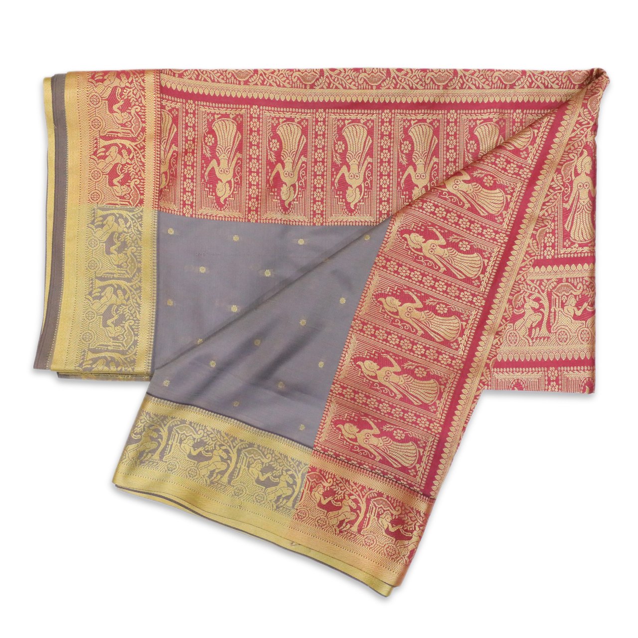 A steel grey body with fine gold Zari dot motifs spread across the body with golden Zari border depicting horse carriage under tree in finest form. Pallu adding charm in crimson red color with stripes having women figurine and horse carriage under tree in alternate stripes giving it rich traditional look and aristocratic charisma.