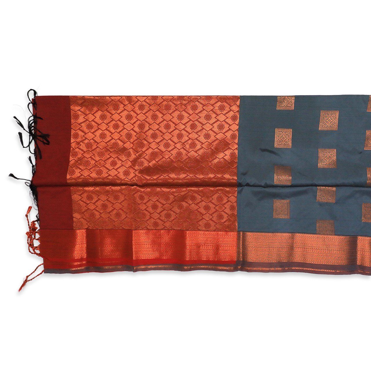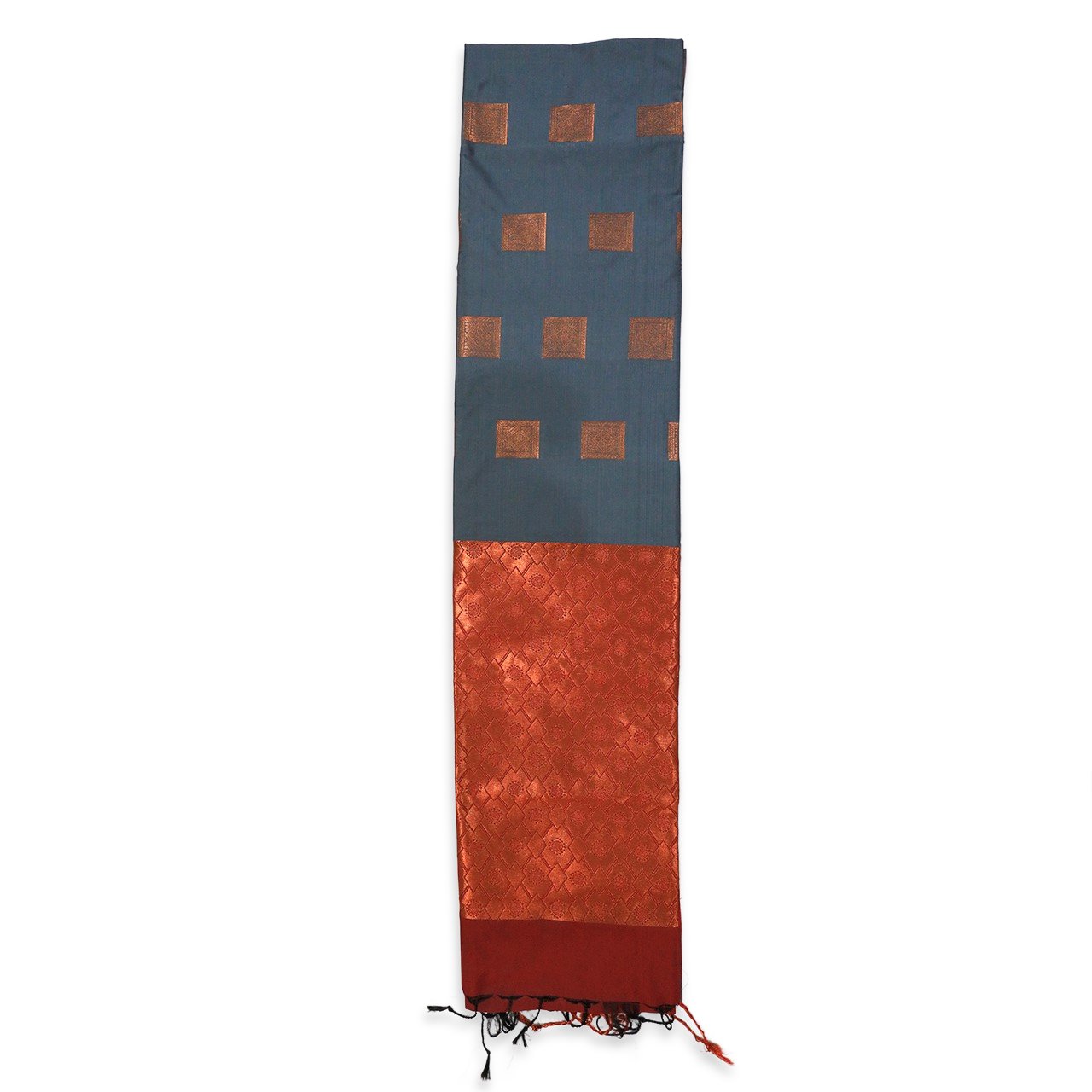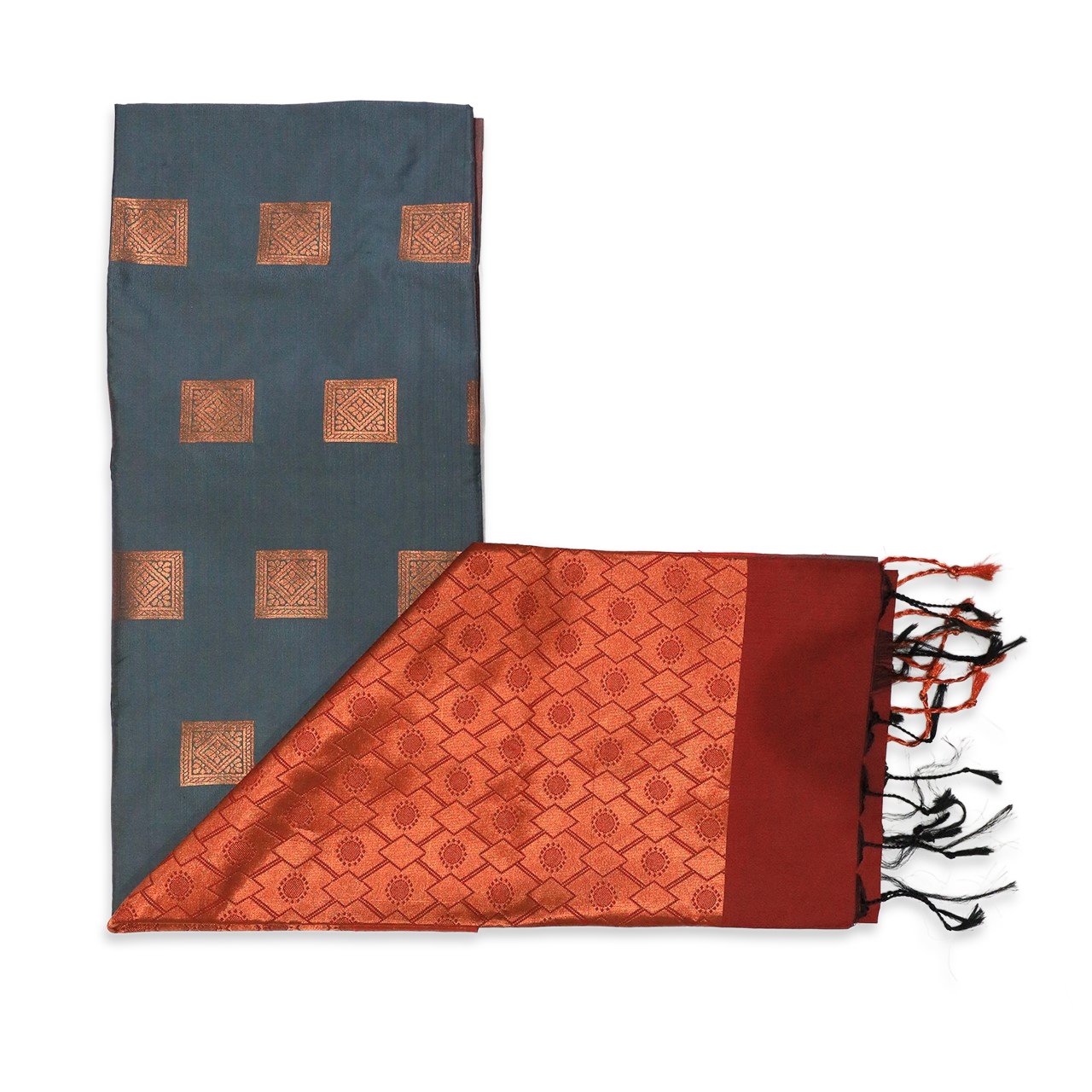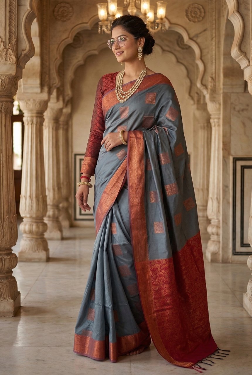 A very soft lustrous addition to wardrobe in elegant color palette, slate grey and brick red enhanced with copper Zari work. Body of saree has very fine square copper Zari motifs adding a luster to soft base, which drapes flawlessly and stays perfectly in accordance with body. Blouse is dark red brick with Zari border. Pallu has the classic evergreen geometric pattern having strong feminine energy represented by red Kumkum bindi in center making a powerful bold statement. It has black and red tassels to ward off evil eye.