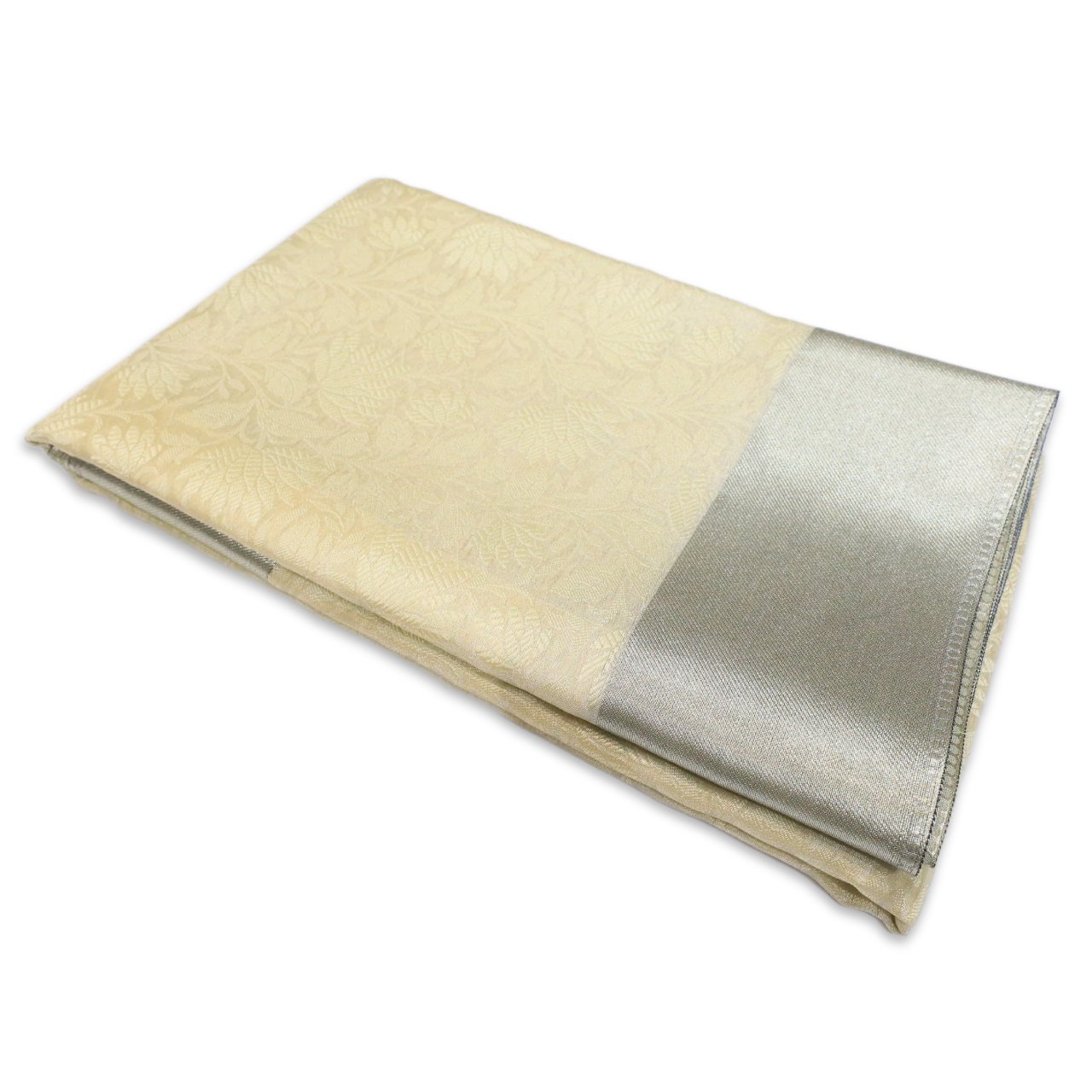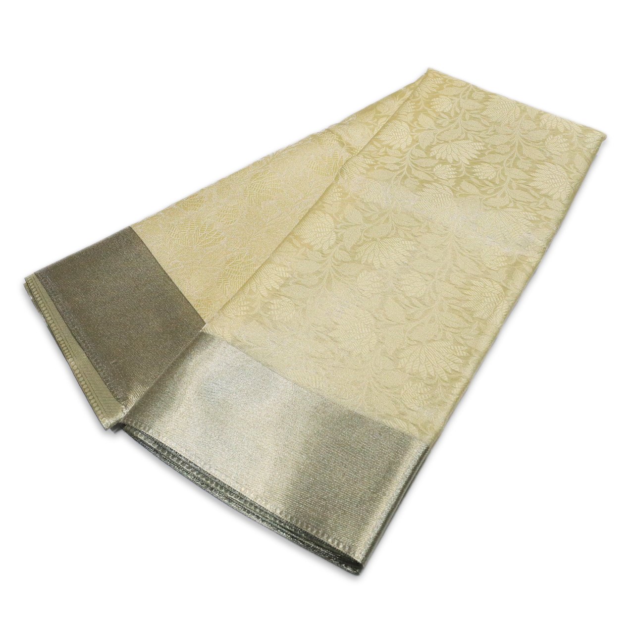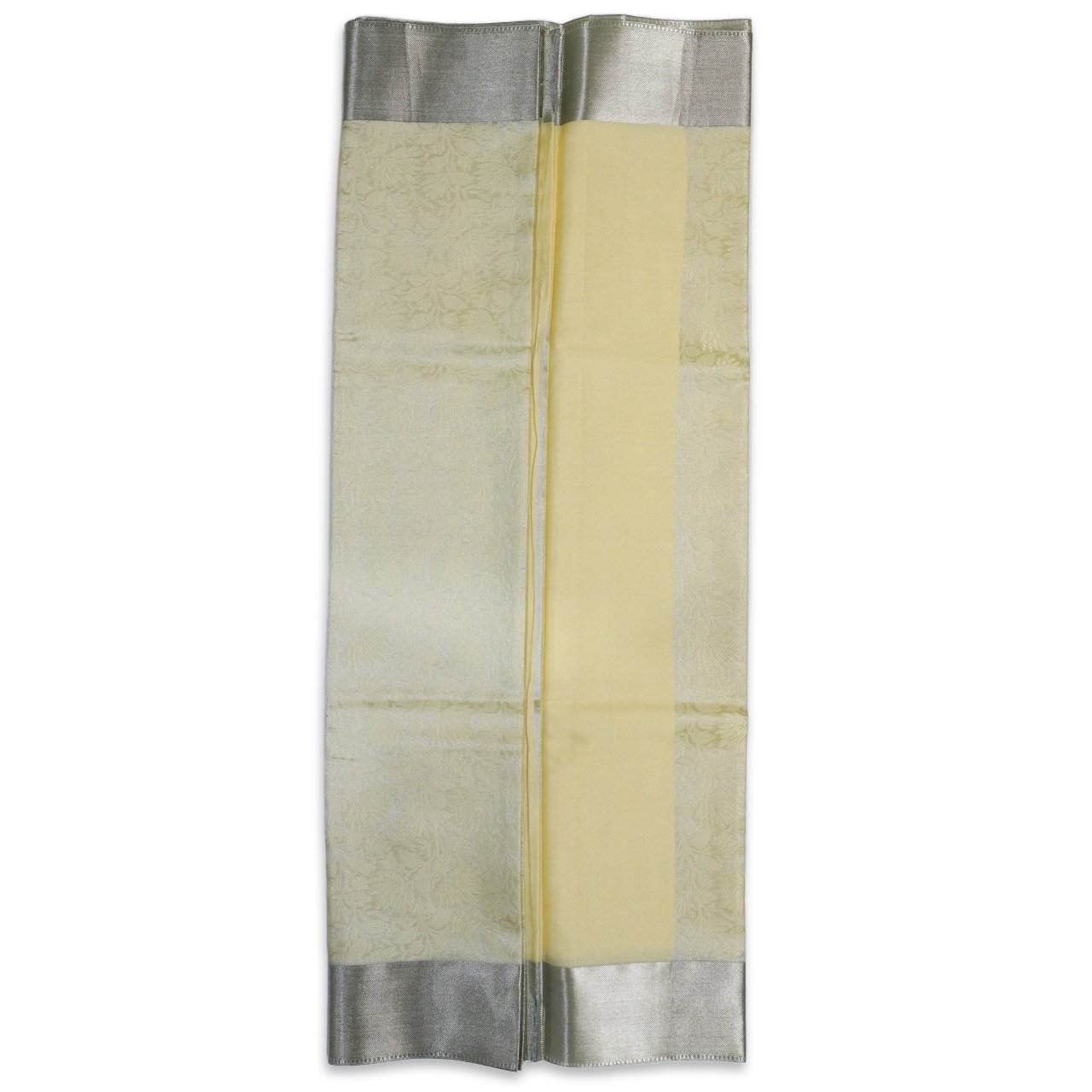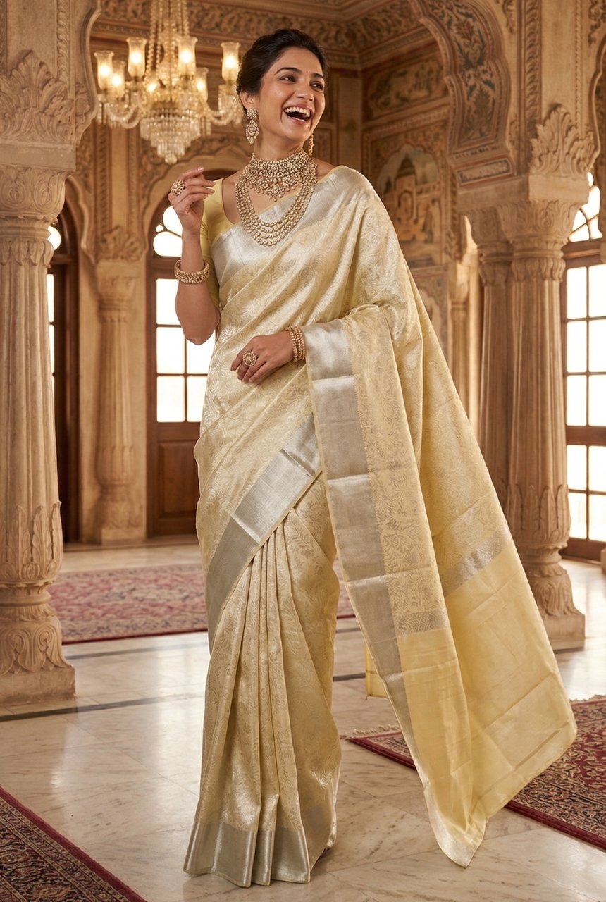 A self-weave saree in beautiful pastel yellow color with greyish hue in weave. Border is silver grey. Body of saree has beautiful flowers weave spreading freshness with running pallu and pastel yellow plain blouse.