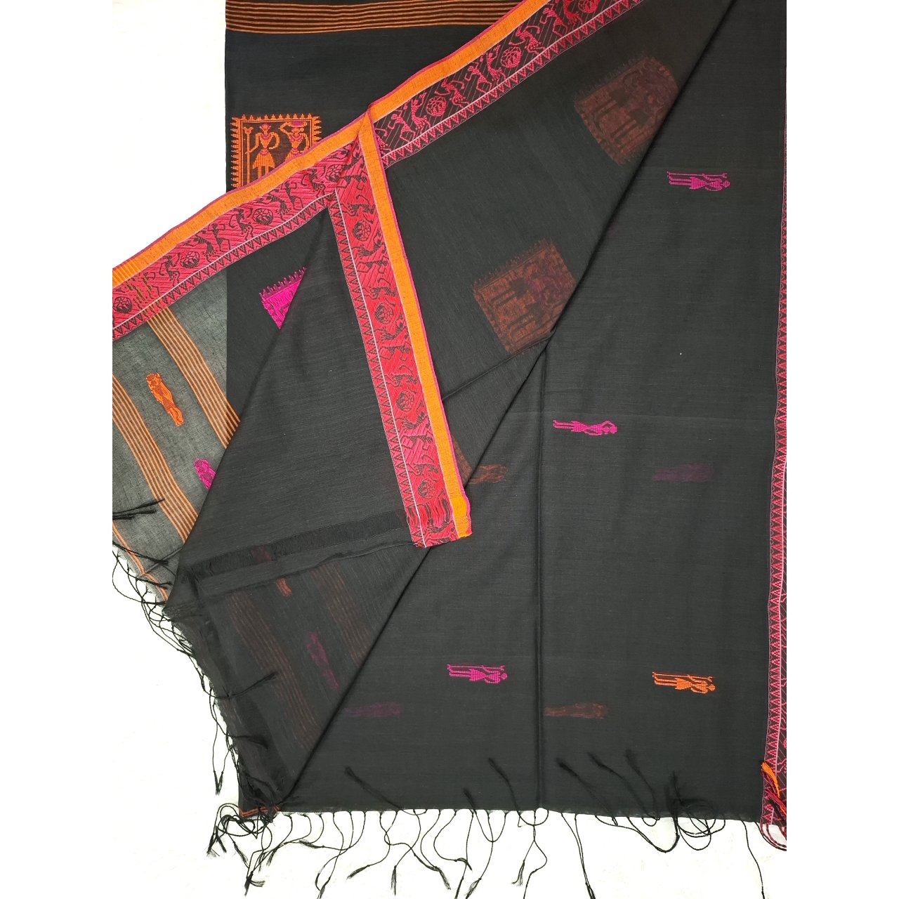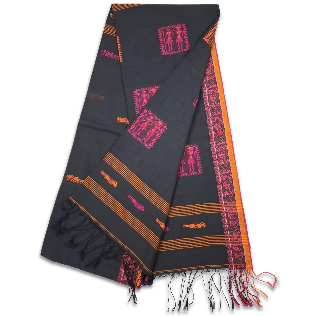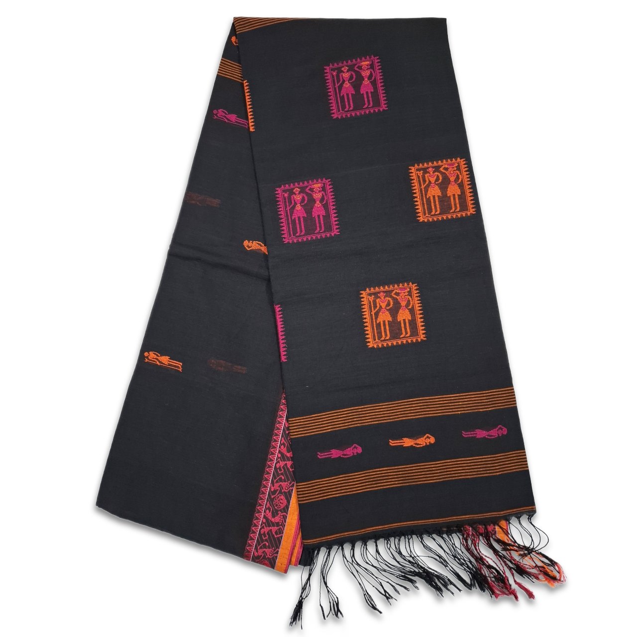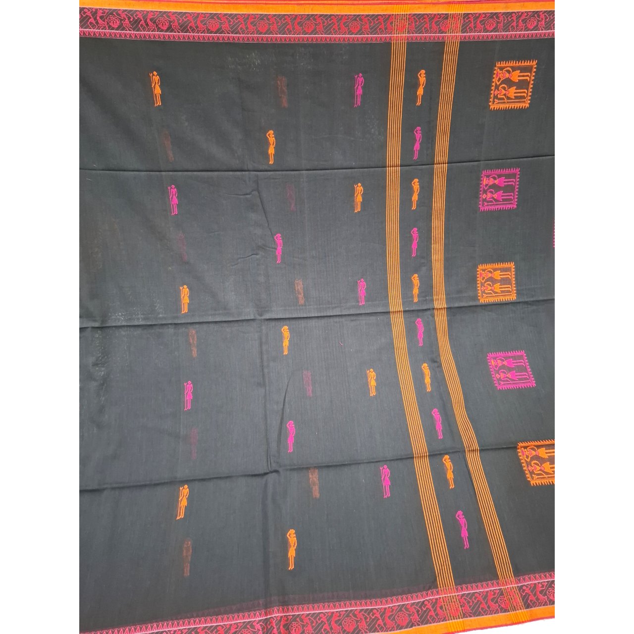 Black saree with pink and orange Warli art inspired tribal motifs saree, blend of folk art and contemporary elegance. Geometric human figures and symbolic squares creating a rich storytelling pattern on saree.