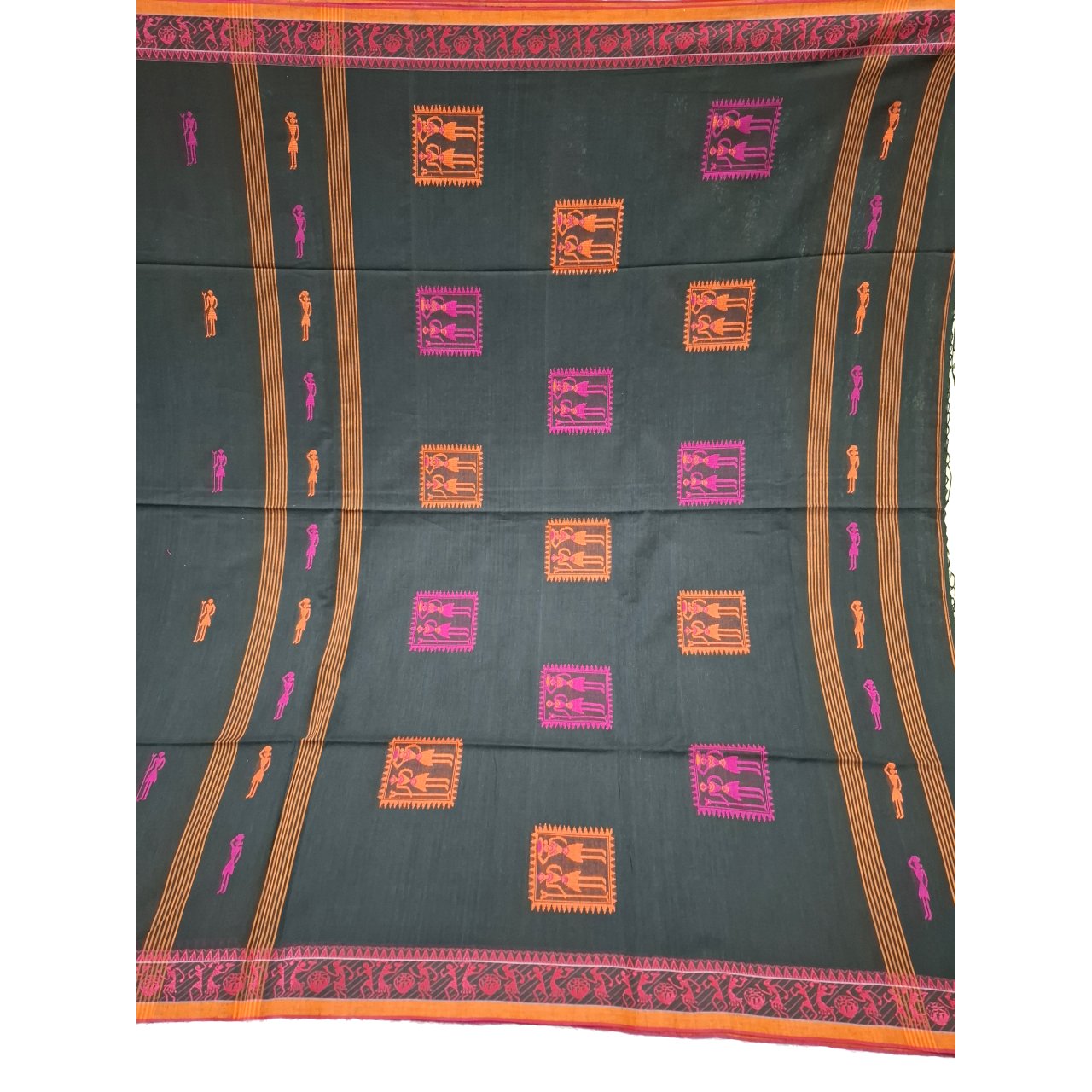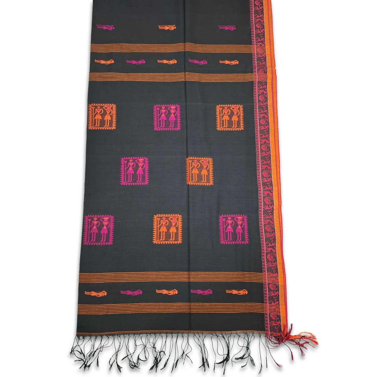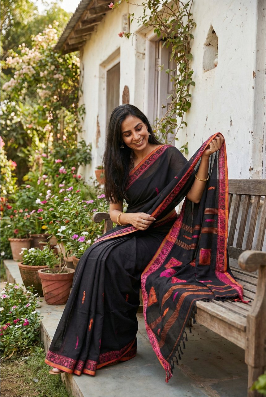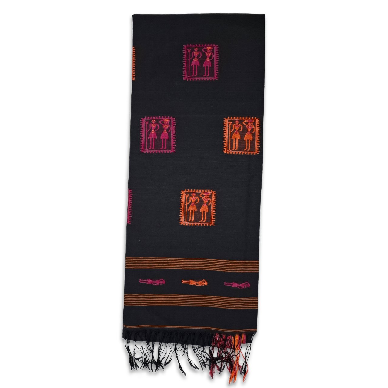 Black saree with pink and orange Warli art inspired tribal motifs saree, blend of folk art and contemporary elegance. Geometric human figures and symbolic squares creating a rich storytelling pattern on saree.
